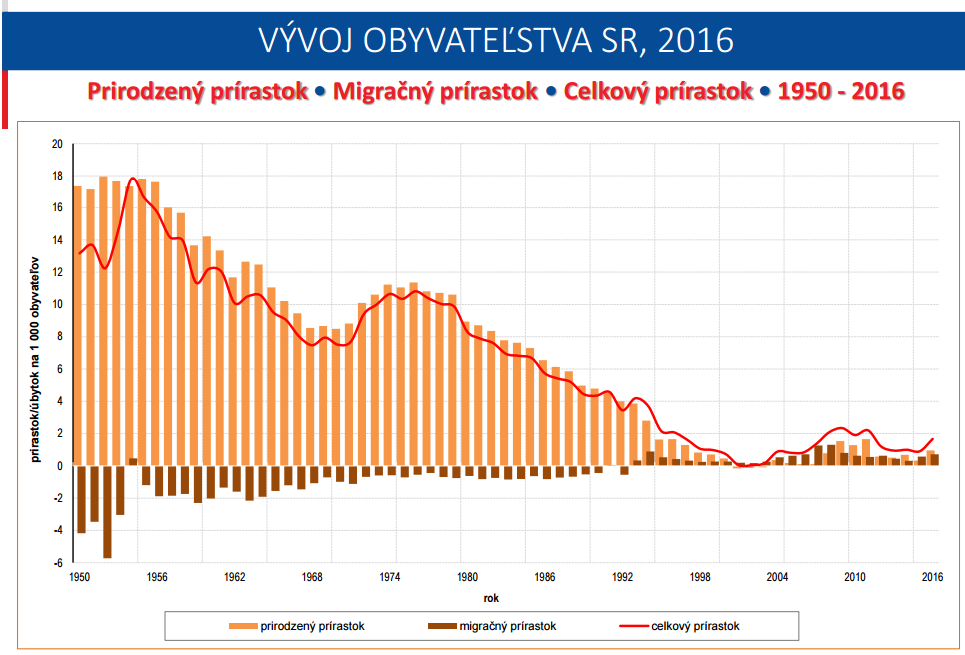 Természetes, migrációs és teljes népszaporulat Szlovákiában az 1950-es évektől kezdődően. Forrás: Statistics.sk
