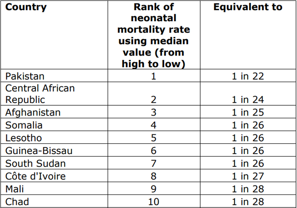Nem sokkal jobb a helyzet a Közép-Afrikai Köztársaságban és Afganisztánban sem, itt 24 ill. 25 újszülöttből egy nem éli túl az első hónapot.