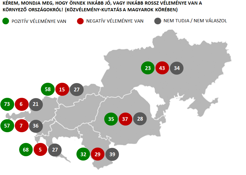 A megkérdezettek leginkább Ausztriáról (73%), Horvátországról (68%), Szlovákiáról (58%) és Szlovéniáról (57%) alkottak pozitív véleményt. Szerbia és Románia esetében közel azonos arányban bírnak pozitív és negatív véleménnyel (a szerbek esetében 32% alkotott pozitív és 29% negatív véleményt, míg a románok esetében 35% alkotott pozitív és 37% negatív véleményt). Ukrajna megítélése viszont már egyértelműen negatív a magyarok körében, keleti szomszédukról csak 23% alkotott pozitív és 43% negatív véleményt.