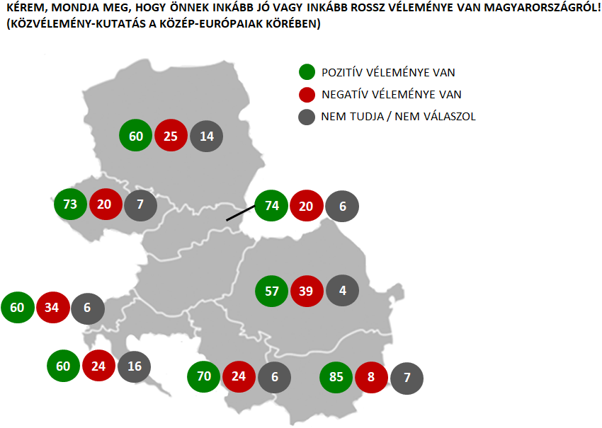 Magyarországról a bolgárok körében 85%, a szlovákok körében 74%, a csehek körében 73%, a szerbek körében 70%, míg a lengyelek, szlovének és horvátok körében egyaránt 60% alkotott pozitív véleményt. Legtöbben a románok körében voltak azok (39%), akik negatív vélemény alkottak Magyarország kapcsán.