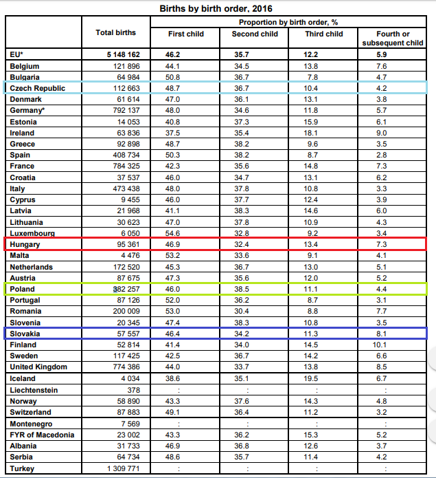 A kimutatás szerint húsz évesnél fiatalabb anyától a legtöbb elsőszülött gyermek Romániában (14,2 százalék), majd Bulgáriában (13,6 százalék), Magyarországon (10,8 százalék) és Szlovákiában (9,9 százalék) született. E tekintetben a legkevesebb 20 éves alatti anya első gyermekét Szlovéniában (1,6 százalék), Olaszországban (1,7 százalék) és Hollandiában (1,8 százalék) szülte.