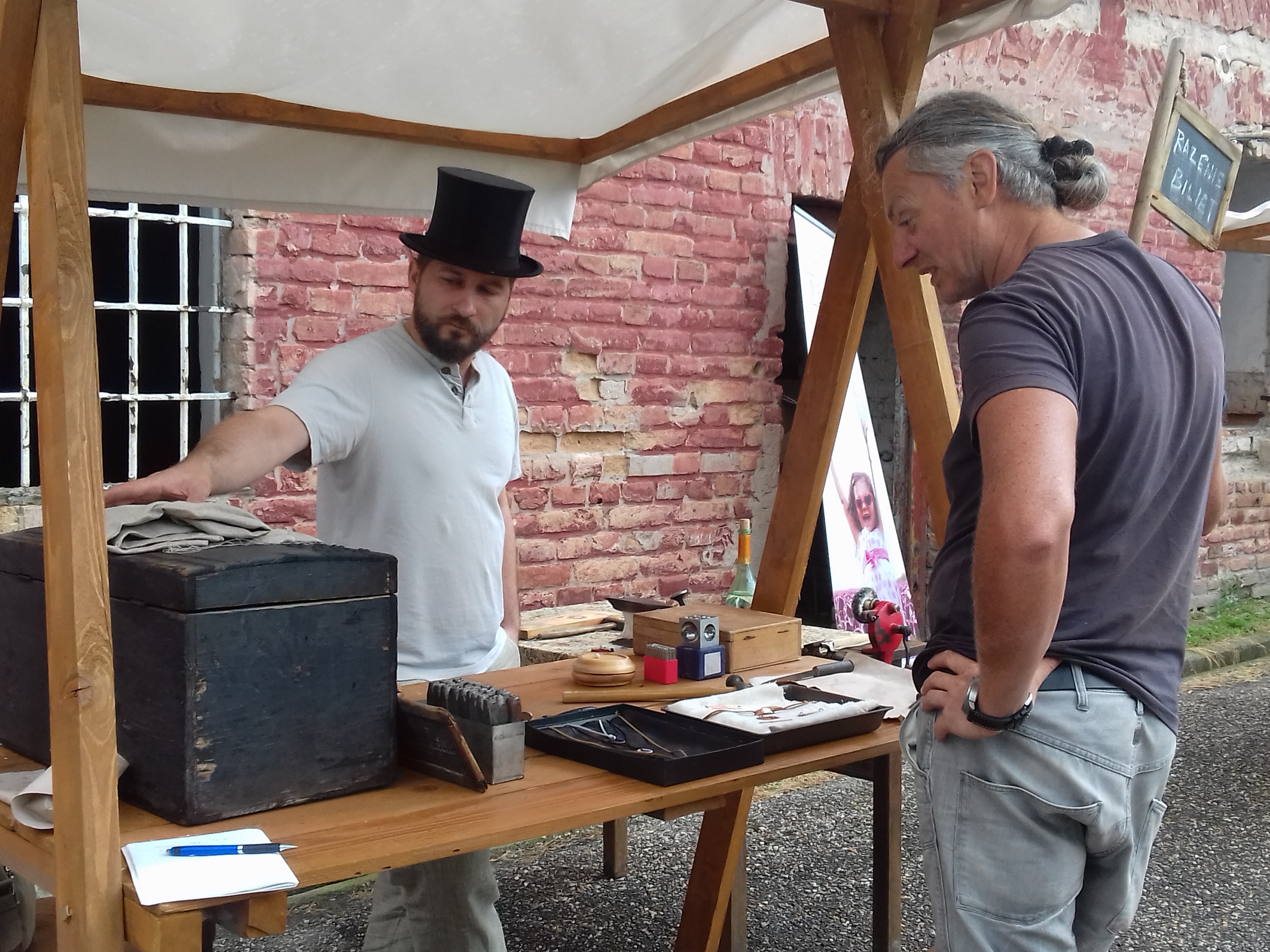 A piacon helyet kaptak az ügyeskezű kézművesek is, mint például a gútai magániskola tűzzománc-mestere, aki itt viszont egy fém-megmunkálási technikát mutatott be. Finom, kézi szerszámaival jelent meg a vásári standon, és csinos kis rézbilétákat készített hátizsákra, szütyőre, tolltartóra, csuklóra, vagy kutyus nyakörvére, fontos információs jelzésekkel, például a gazdi telefonszámával.