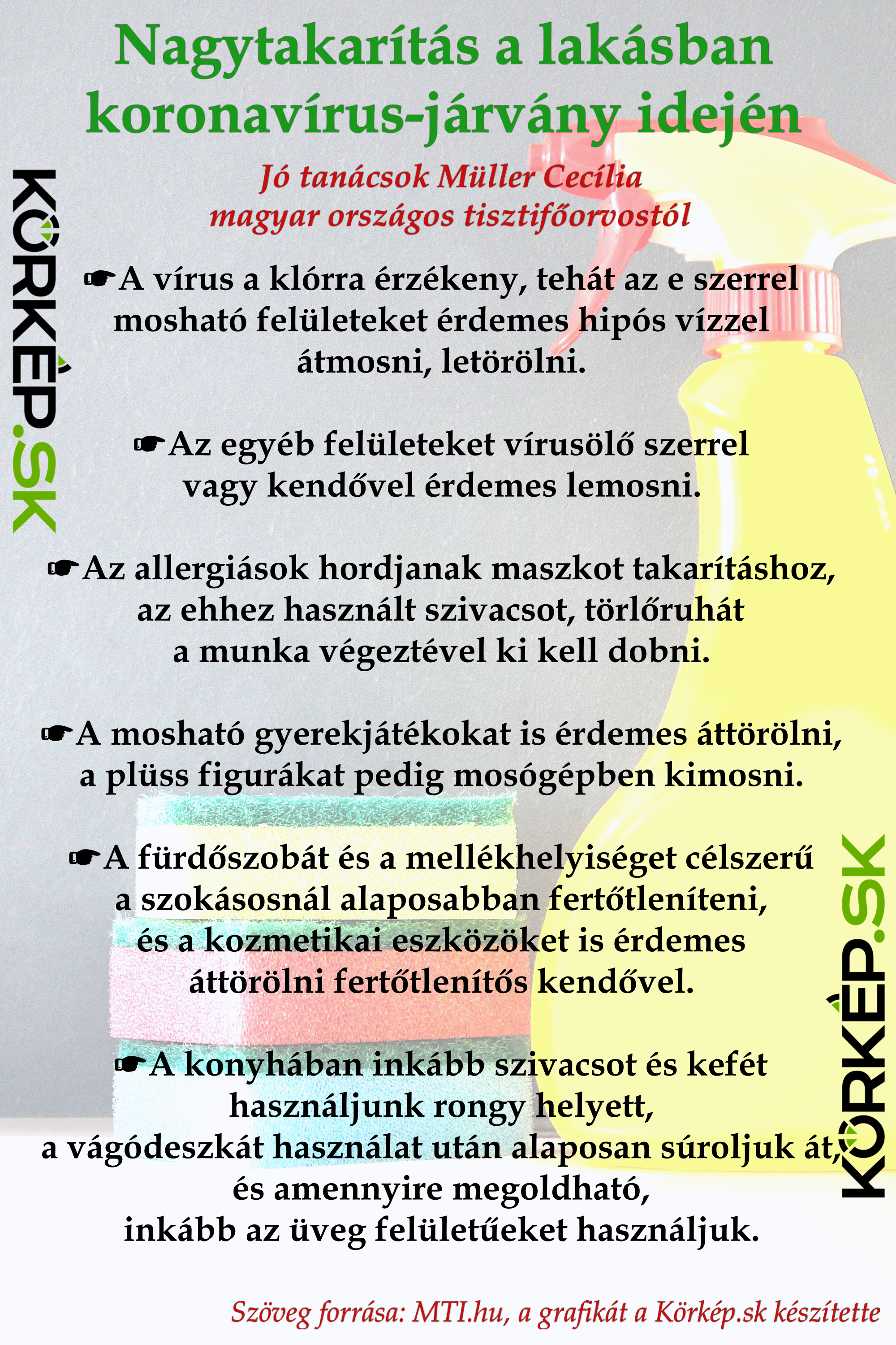 Idén nem csak az ünnep, de a koronavírus-járvány miatt is fokozott szerepet kap a takarítás. Az alábbiakban Müller Cecília magyar országos tisztifőorvos ajánlásait mutatjuk: