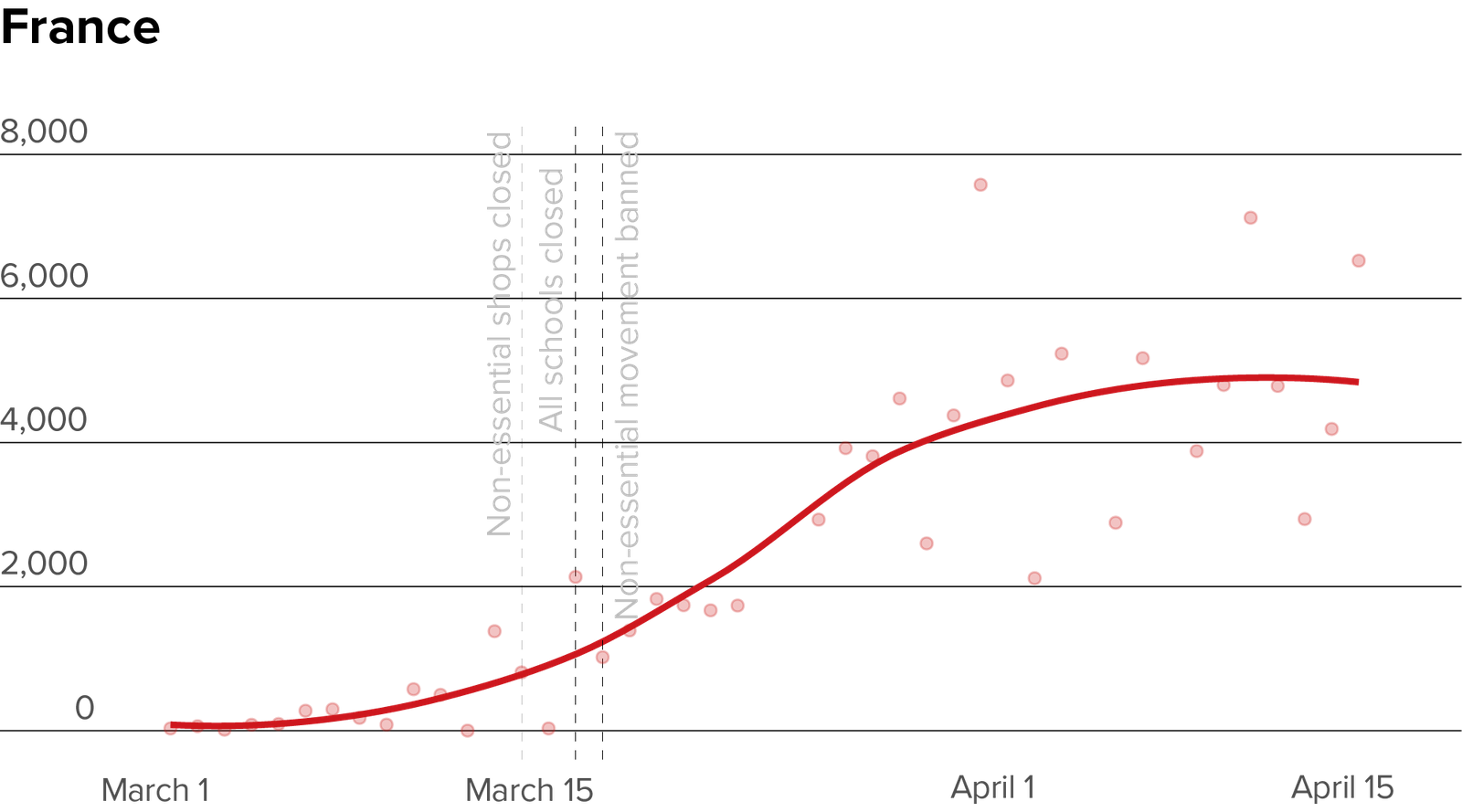A görbe ellapítása a felsorolt ország közül legjobban Franciaországnak sikerült, ám azon az áron, hogy hosszabb idei marad vele a koronavírus.