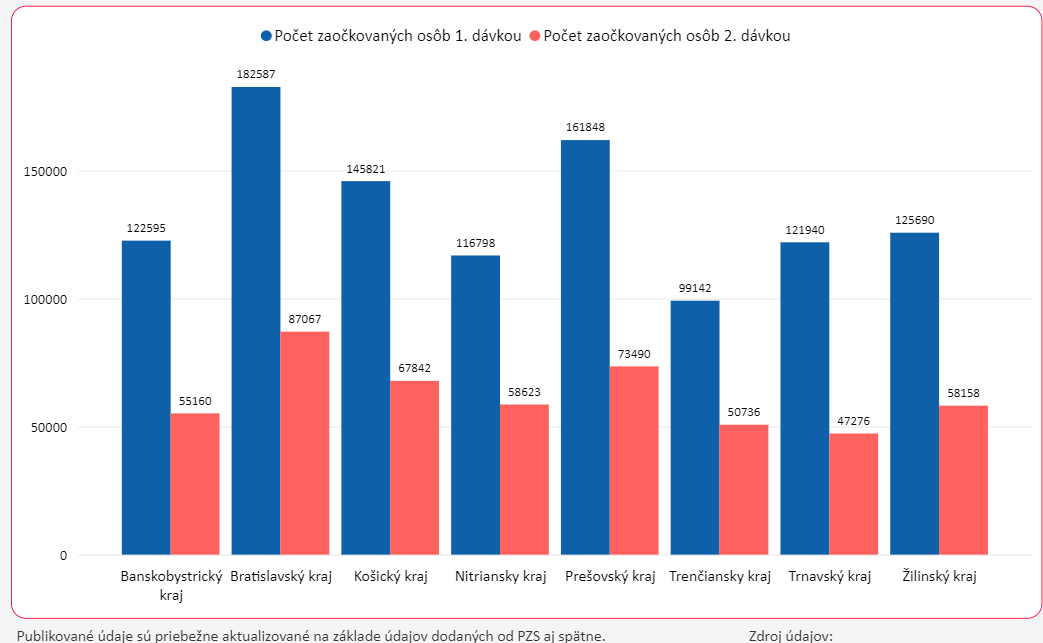 Az elvárt 60 százalékos oltottsági szint eléréséhez még 2 210 250 szlovákiai polgárt kell beoltani. A legtöbb beoltott személy Pozsony és Eperjes megyében van, a legkevesebb Trencsén és Nagyszombat megyében.