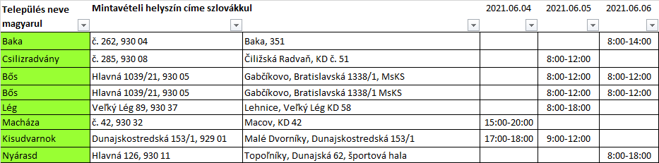 Ideiglenes mintavételi helyszínek a Dunaszerdahelyi járásban: