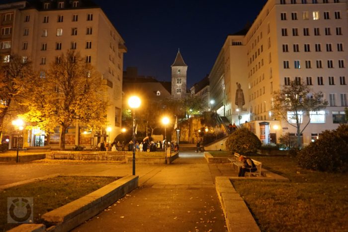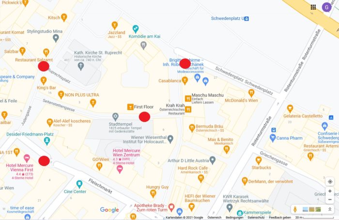 Alig két utca távolságra Kujtim Fejzulai a Desider-Friedmann téren állt, ahol a Fleischmarkt felé nézve tüzet nyitott. Az itteni lépcsőknél halt meg a terrortámadás első áldozata.