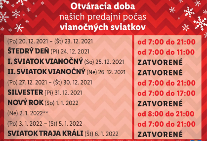A LIDL üzletei 23-ig reggel 7:00-tól 21:00-ig tart nyitva, majd szenteste reggel 7-től 11 óráig várja a vásárlókat. A karácsonyi ünnepek után 27-től 30-ig 7:00-tól 21:00-ig lesz nyitva, szilveszter napján pedig 17 órakor zár be.