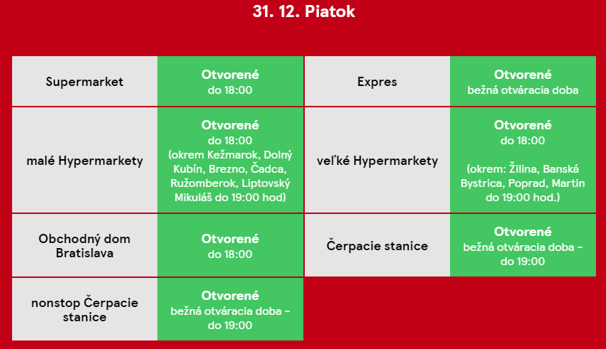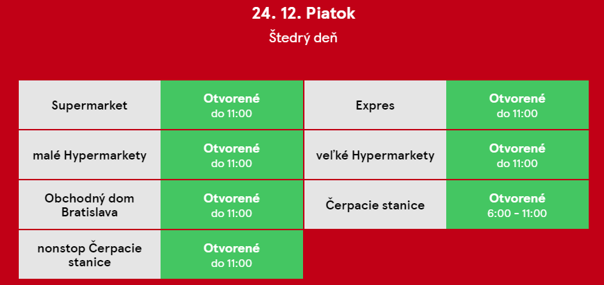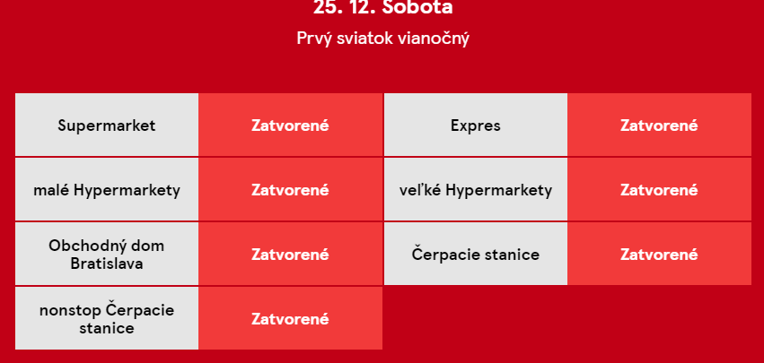 Bárkivel előfordulhat, hogy az utolsó pillanatban jön rá, valakinek még nem vett ajándékot, esetleg hiányzik valamilyen hozzávaló a karácsonyi vacsorához. Szlovákiában az ünnepi boltzár bevezetése óta december 25-én és 26-án biztosan nem találjuk nyitva a nagy üzletláncokat, 24-én azonban még kinyitnak az üzletek. Az alábbiakban a legnagyobb élelmiszerláncok ünnepi nyitvatartását gyűjtöttük össze.