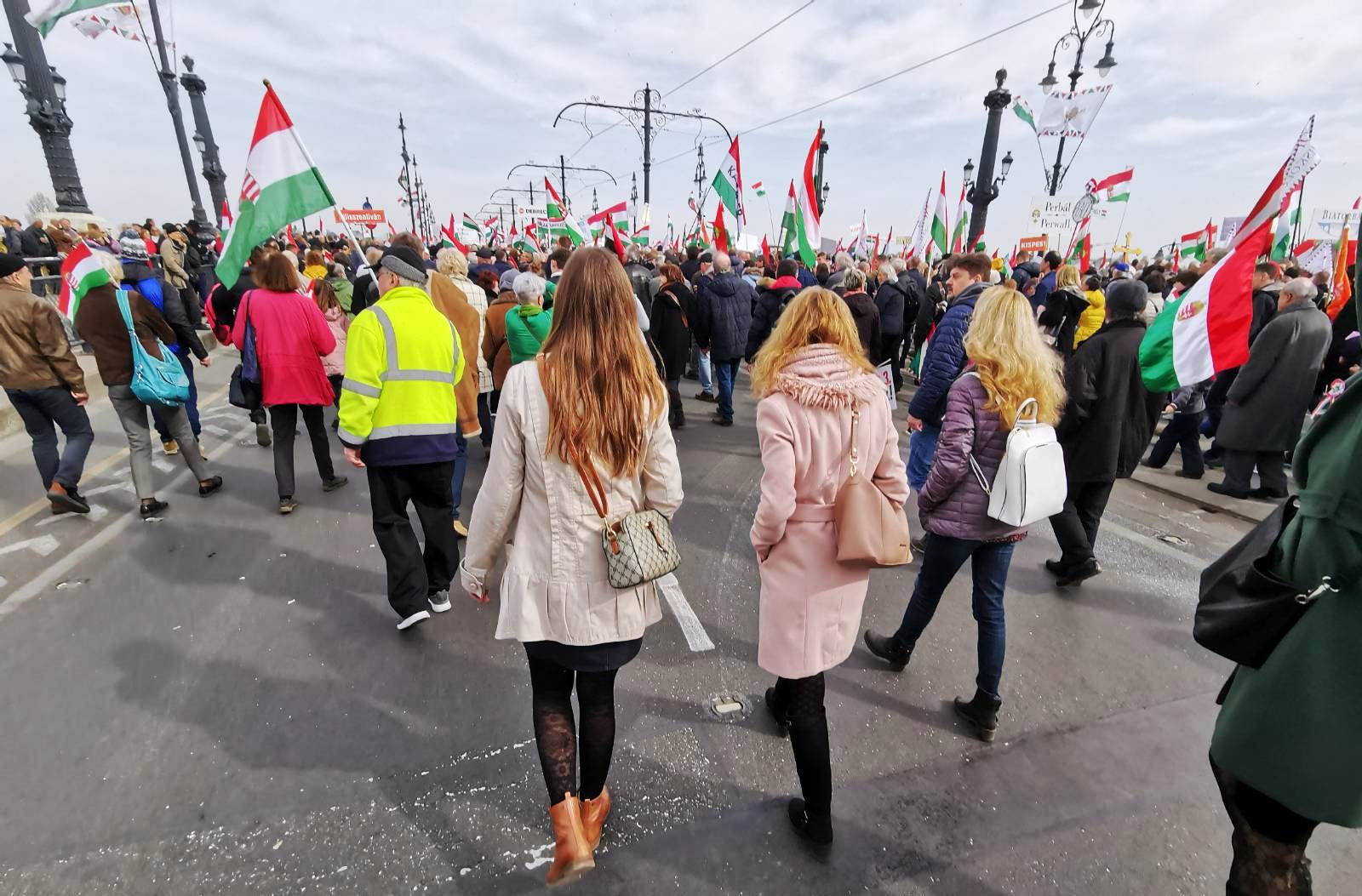 A Civil Összefogás Fórum – Civil Összefogás Közhasznú Alapítvány (CÖF-CÖKA) Békemenetének résztvevõi vonulnak a Margit hídon az 1848-49-es forradalom és szabadságharc kitörésének évfordulóján, 2022. március 15-én.
