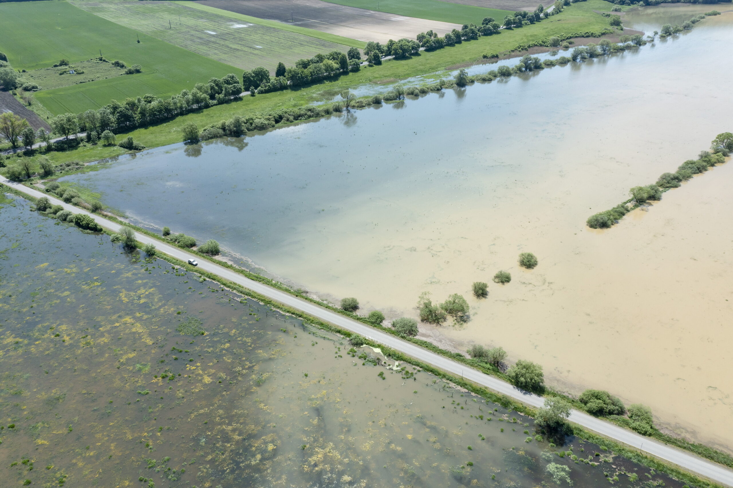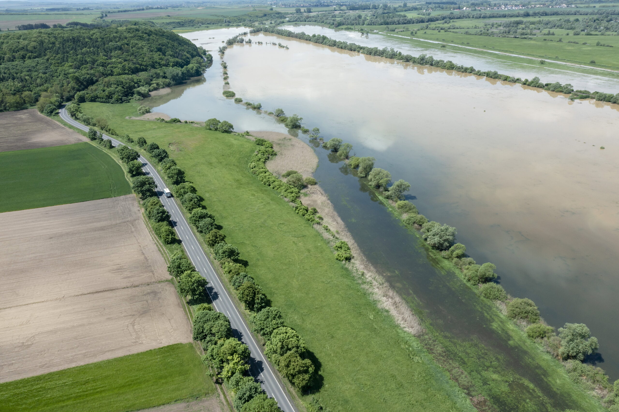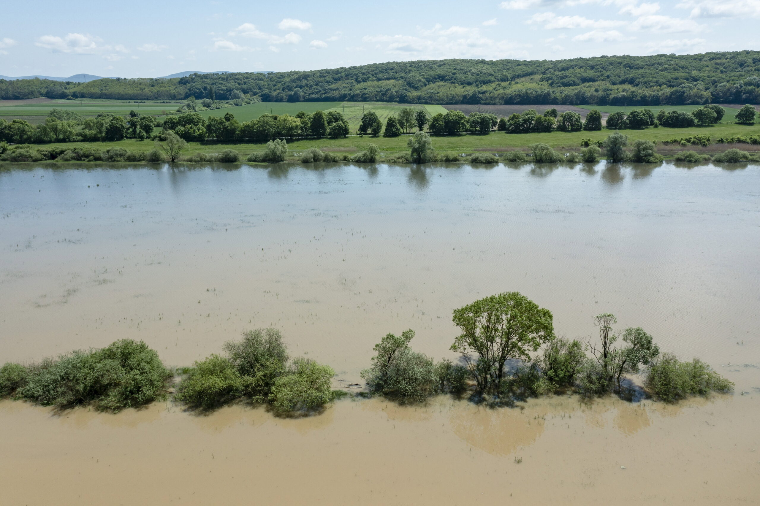 A drónnal készített képen vízben áll a Szentlélek-patak ártere Szécsény közelében 2023. május 19-én.