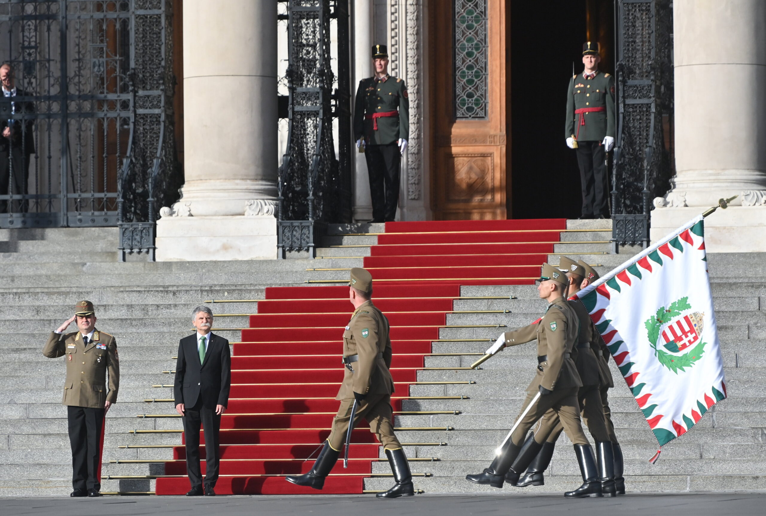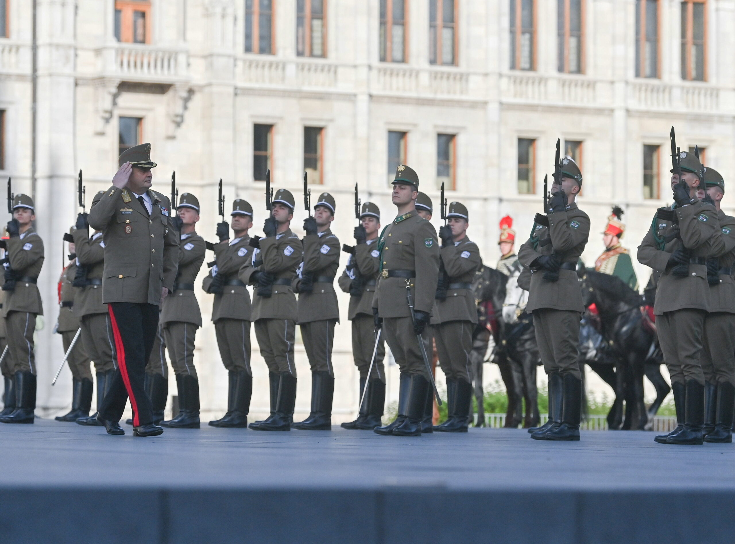 Böröndi Gábor vezérezredes, a Honvéd Vezérkar fõnöke (b) elhalad a katonai díszegység elõtt, mielõtt katonai tiszteletadás mellett felvonják Magyarország nemzeti lobogóját az 1956-os forradalom és szabadságharc 67. évfordulóján az Országház elõtti Kossuth Lajos téren 2023. október 23-án.