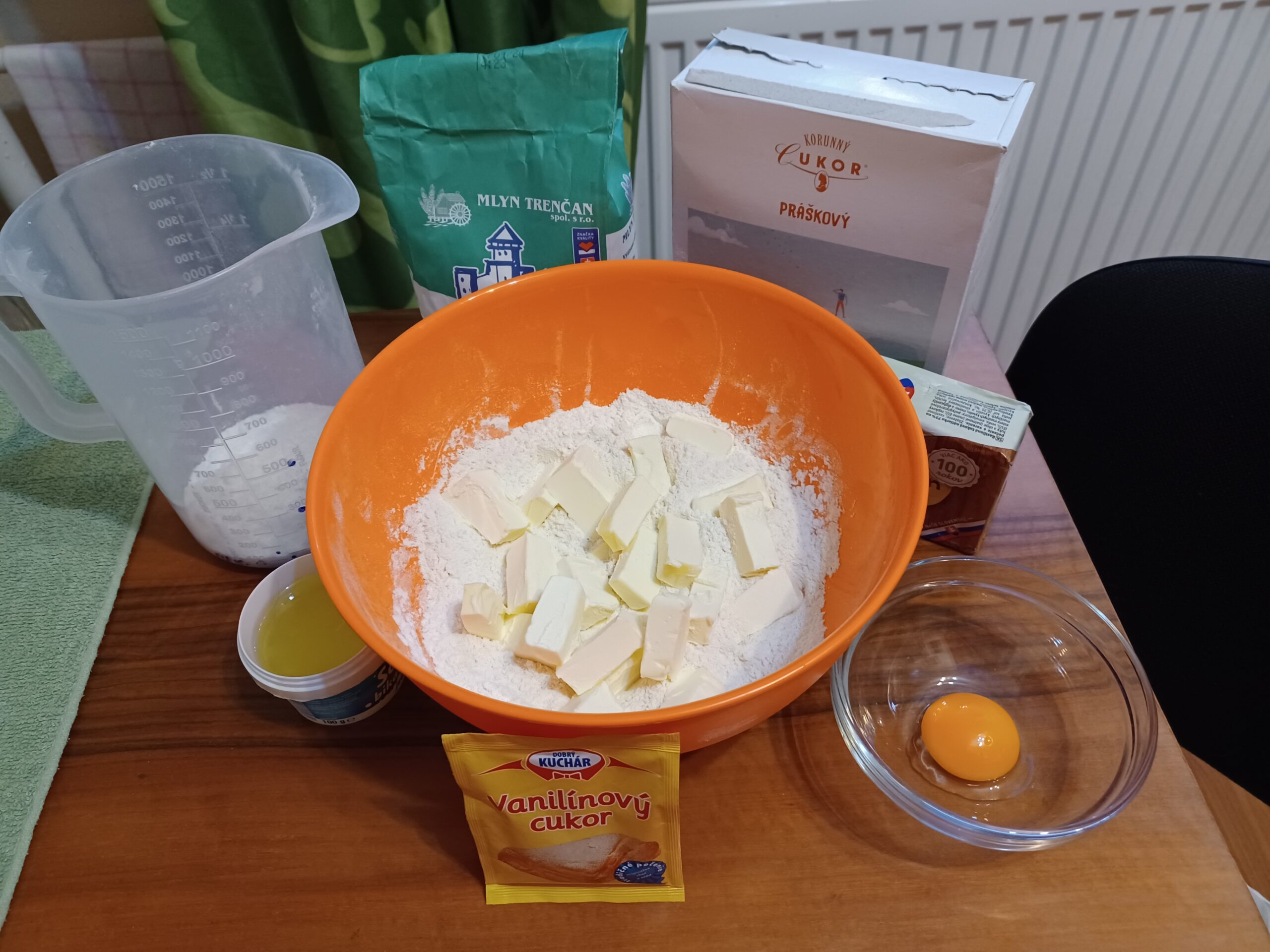 Miután összemorzsoltam, hozzáadom a porcukrot, a vaníliás cukrot, és a tojássárgáját. Ha elég nagy a tojás, egyet használok, ha kisebb, akkor kettőt, de előre mindig csak egyet teszek bele. A kezeddel majd érezni fogod, szükséges-e a másik. Jól összegyúrom, de még mindig igyekszem gyorsan dolgozni – nem kell, sőt, nem szabad sokáig gyúrni.