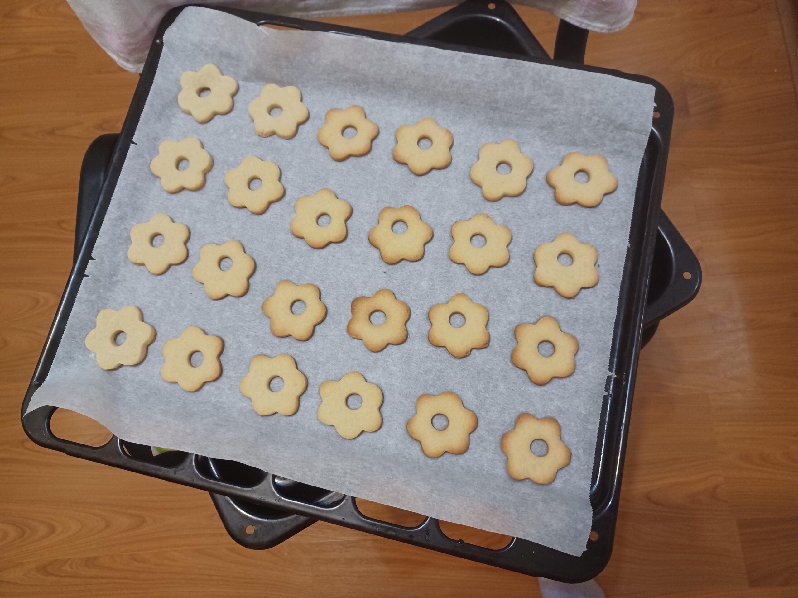 A pihentetést követően a tésztát lisztezett gyúródeszkán (nyújtólapon) nagyjából 3 – 4 milliméteres vastagságúra nyújtom, és virág- vagy kör alakú formácskákkal kiszaggatom. Minden második tésztának a közepét is kiszúrom egy kisebb formával, ezek képezik majd a süti felső részét. Jómagam mindig a lyukas közepű karikákat készítem el először, az alsó, telt részeket pedig a tészta újragyúrását követően.