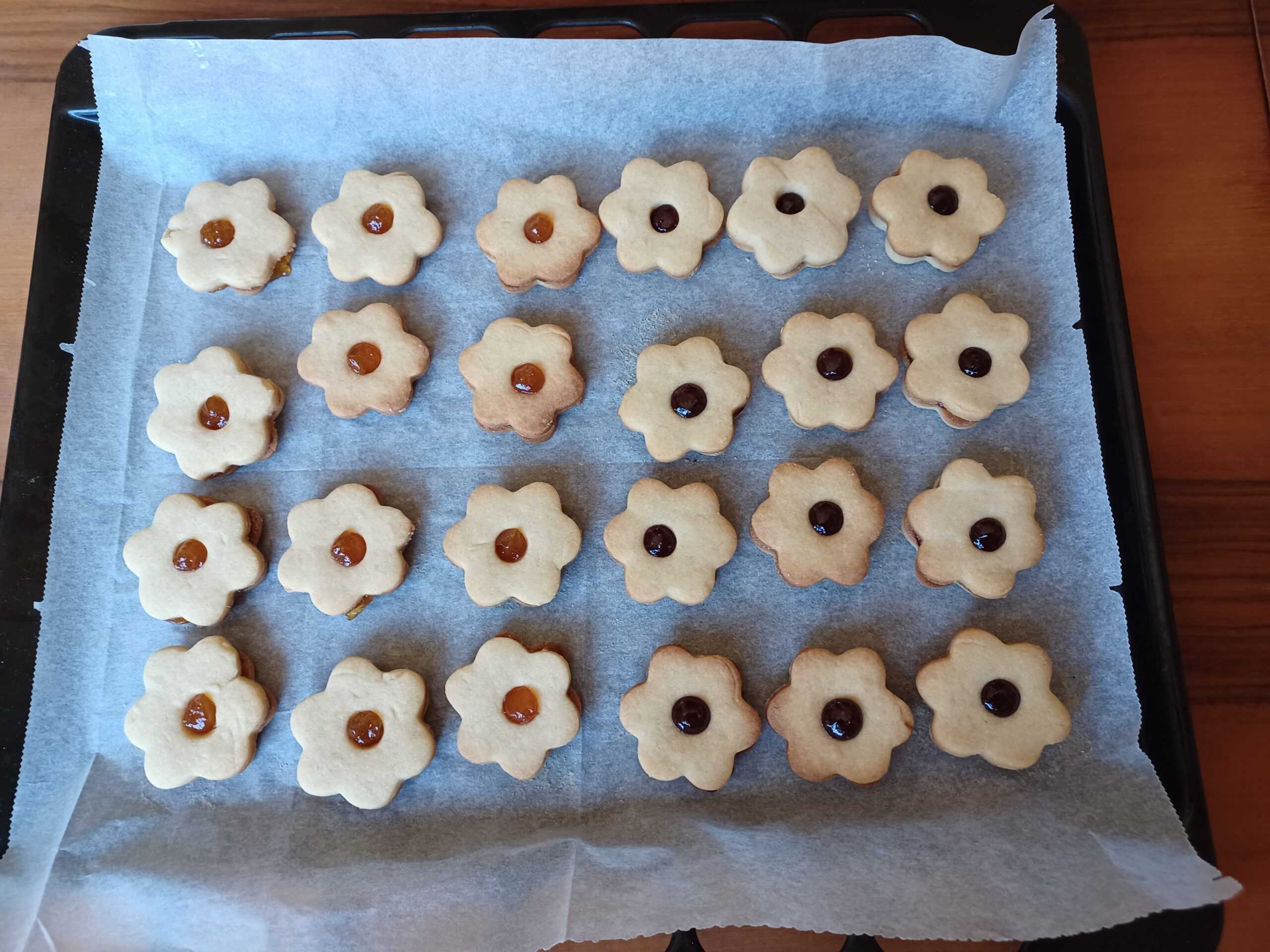 A már kiszaggatott tésztaformákat sütőlemezre teszem, amelyet előtte befedtem sütőpapírral. Ugyanúgy, ahogy mézest, elég távol rakom egymástól, mert sütés közben megnövekednek, így hajlamosak összesülni. Mint már említettem, nekem 30 x 40 cm-s sütőlemezeim vannak, erre 4 x 6 formácska fér rá, tehát összesen 24.