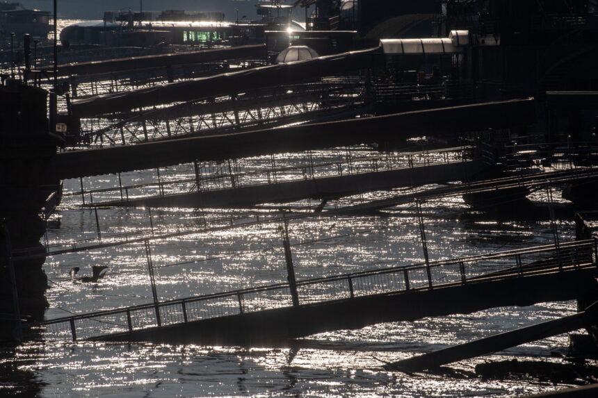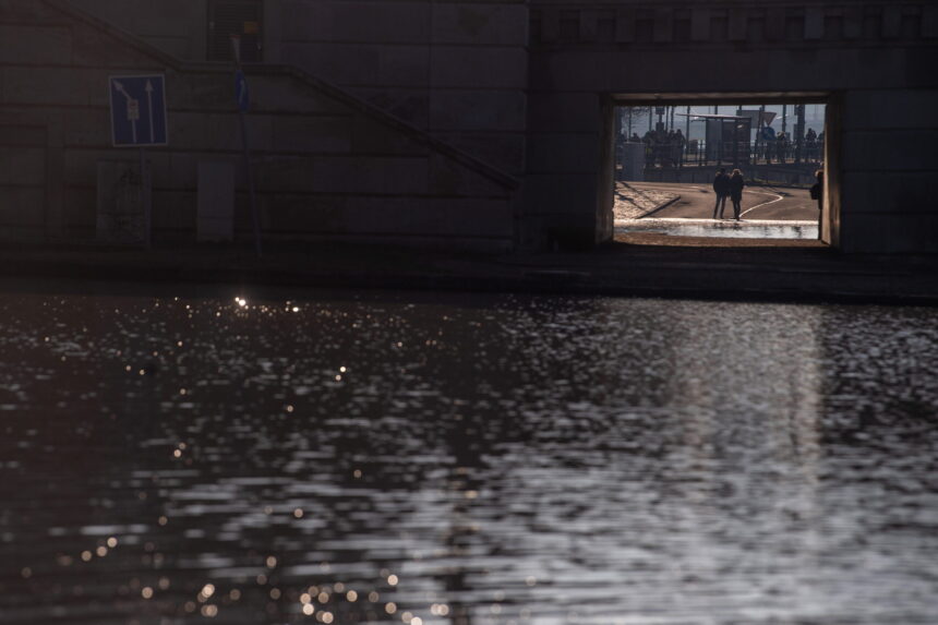 A kiáradt Duna Budapesten 2023. december 28-án. Hosszan elnyúló tetõzések, lassú apadás kíséri a dunai árhullámot; Budapesten az elõzõ nap este tetõzött az árhullám, ekkor a legmagasabb vízállás 693 centiméter volt.