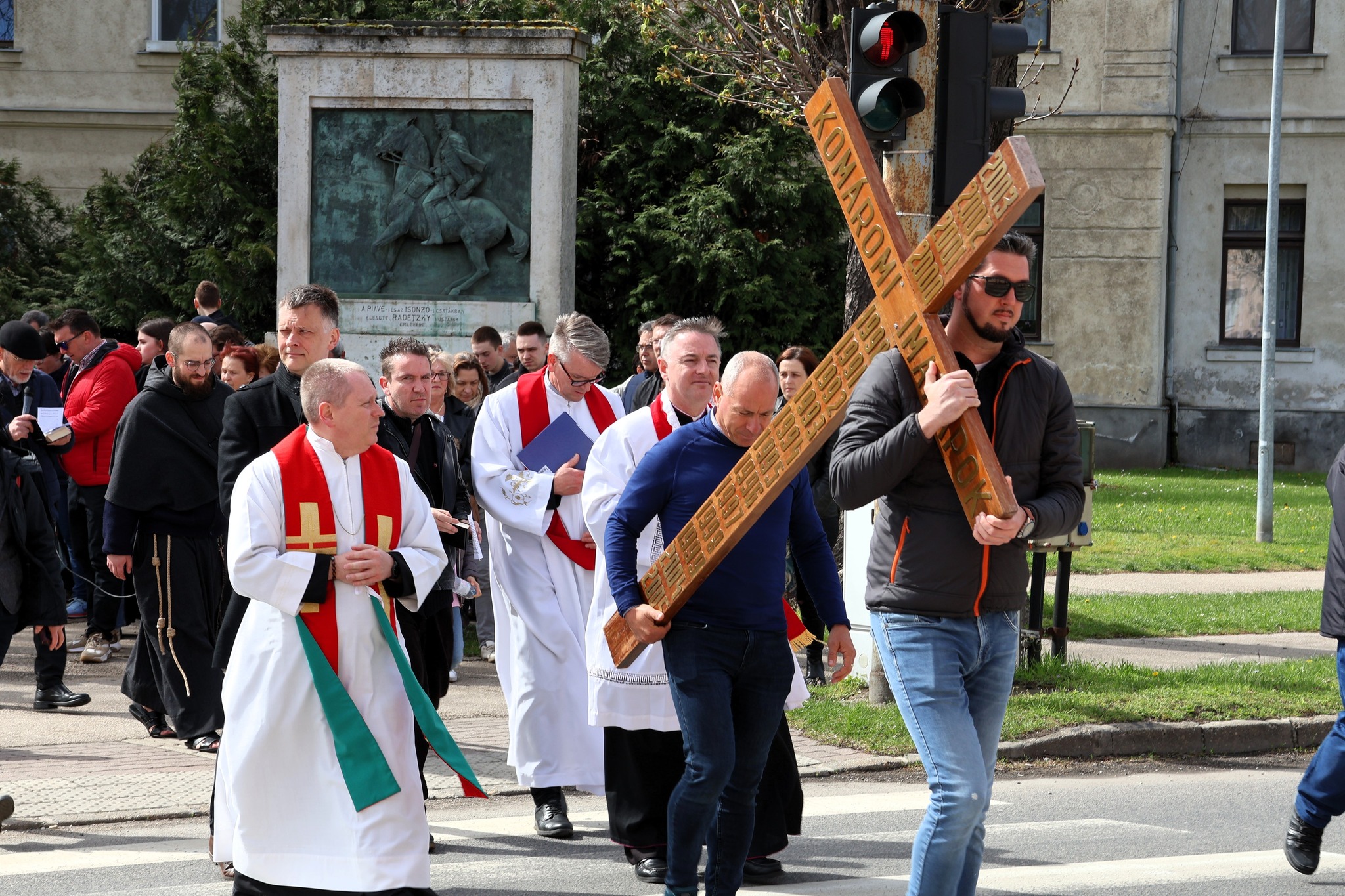 Nagypénteken jelentős számú tömeget megmozgató keresztút-járásra kerül sor, végighaladva a belváros utcáin, emlékhelyein, majd a két Komárom között – áthaladva a Duna fölött átívelő Erzsébet-hídon. Az ünnepi menet a Szent András-bazilikából indult, egészen a dél-komáromi (magyarországi) Jézus Szíve-nagytemplomig.