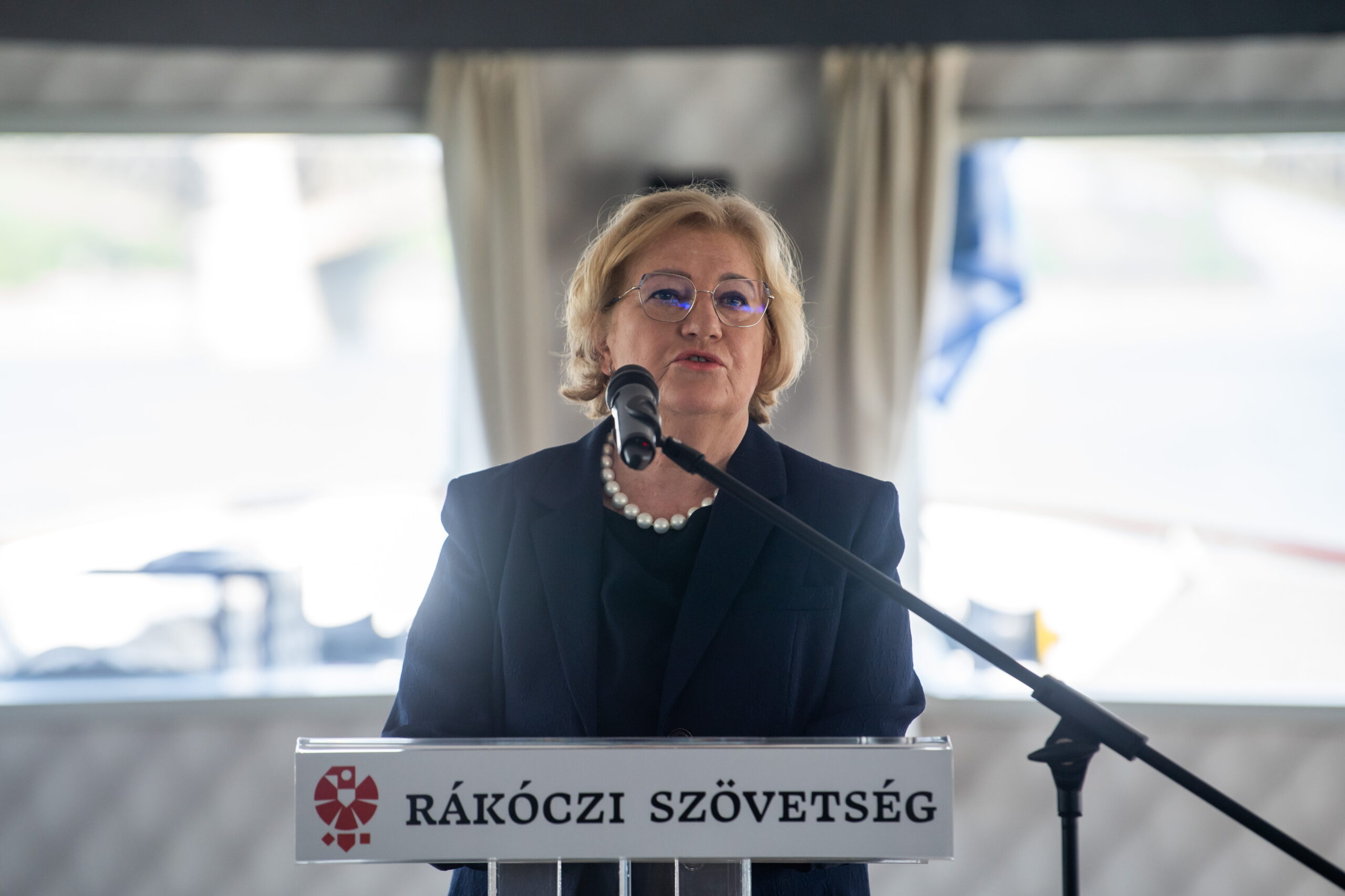 Szili Katalin miniszterelnöki fõtanácsadó beszédet mond a Felvidékrõl kitelepített magyarok emléknapja emlékünnepségén a Budapest Rendezvényhajón 2024. április 12-én. Az eseményt a Rákóczi Szövetség szervezte.