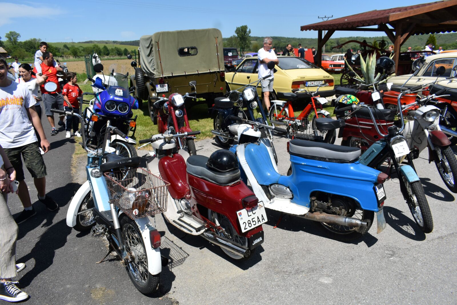 Az emberek láthatóan nagy érdeklődéssel szemlélik a motorbicikliket és autókat, büszkén mutatják őket a fiataloknak.