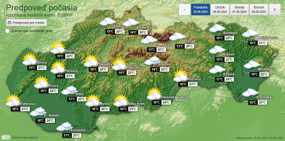 Felhős, borult idővel indul a hét, a délután folyamán több felé felszakadozhat a felhőzet. Nyugaton és Közép-Szlovákia déli járásaiban csapadékra is számítani kell, akár zivatarok is előfordulhatnak. Északon hűvös lesz. A legmagasabb nappali hőmérséklet 22 és 27 körül alakul. Az északi-északnyugati szél délkeleten megerősödhet (30-55 km/óra). Az ország keleti harmadában (többek között a Rozsnyói, Kassa környéki, Tőketerebesi és Nagymihályi járásokban) elsőfokú viharriasztás lesz érvényben a déli óráktól este 19 óráig.