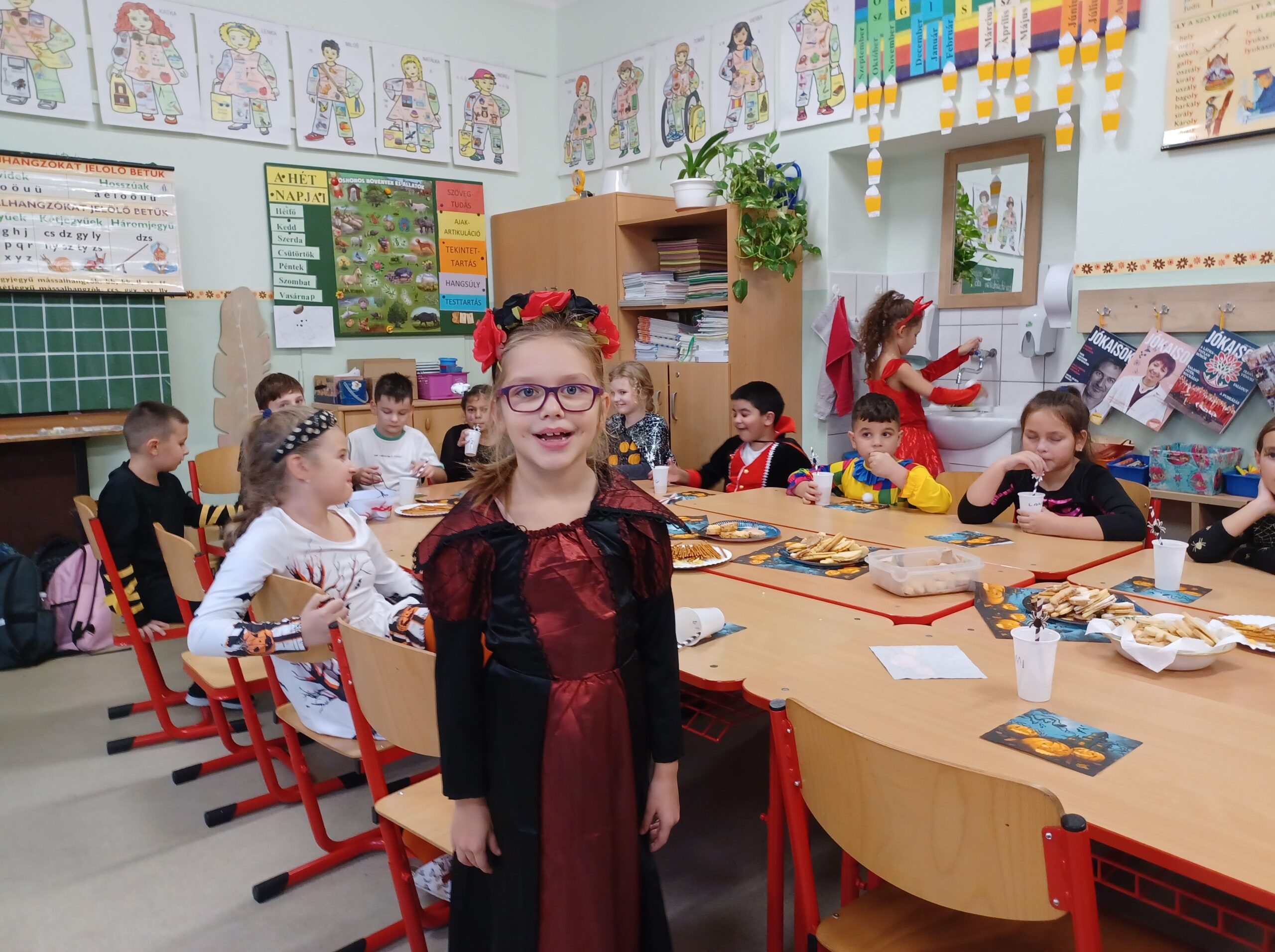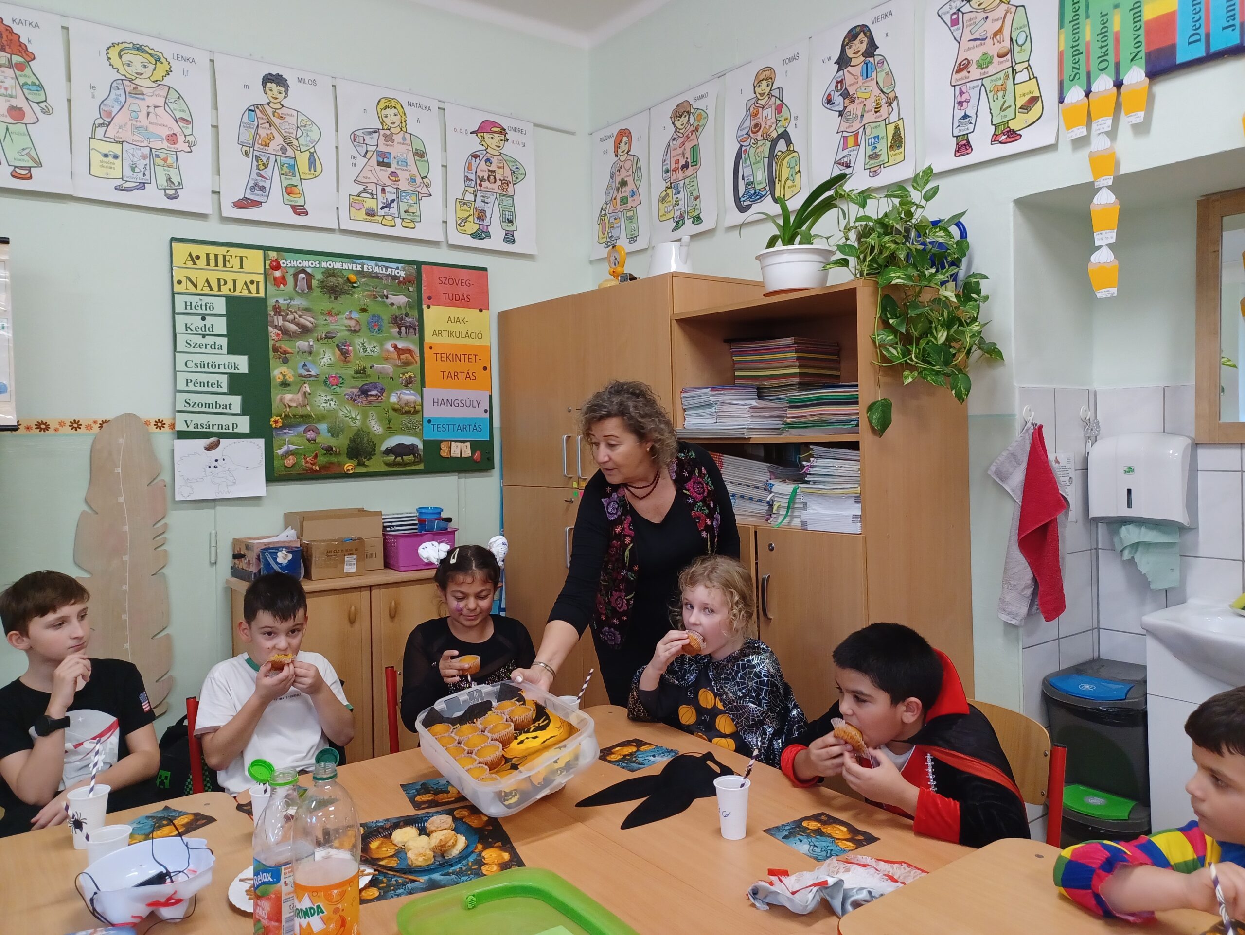 Az őszi szünet előtti rekreációs délutánon az iskola alsó tagozatos osztályai Tökjó buli címmel különböző szórakoztató programokkal töltötték idejüket. Mi a 2. a. osztály napközis csoportjához látogattunk el, ahol Kiss Gabriella – Gabi néni – szárnyai alatt a gyerekek szemmel láthatóan egy Tökjó buliban vehettek részt.