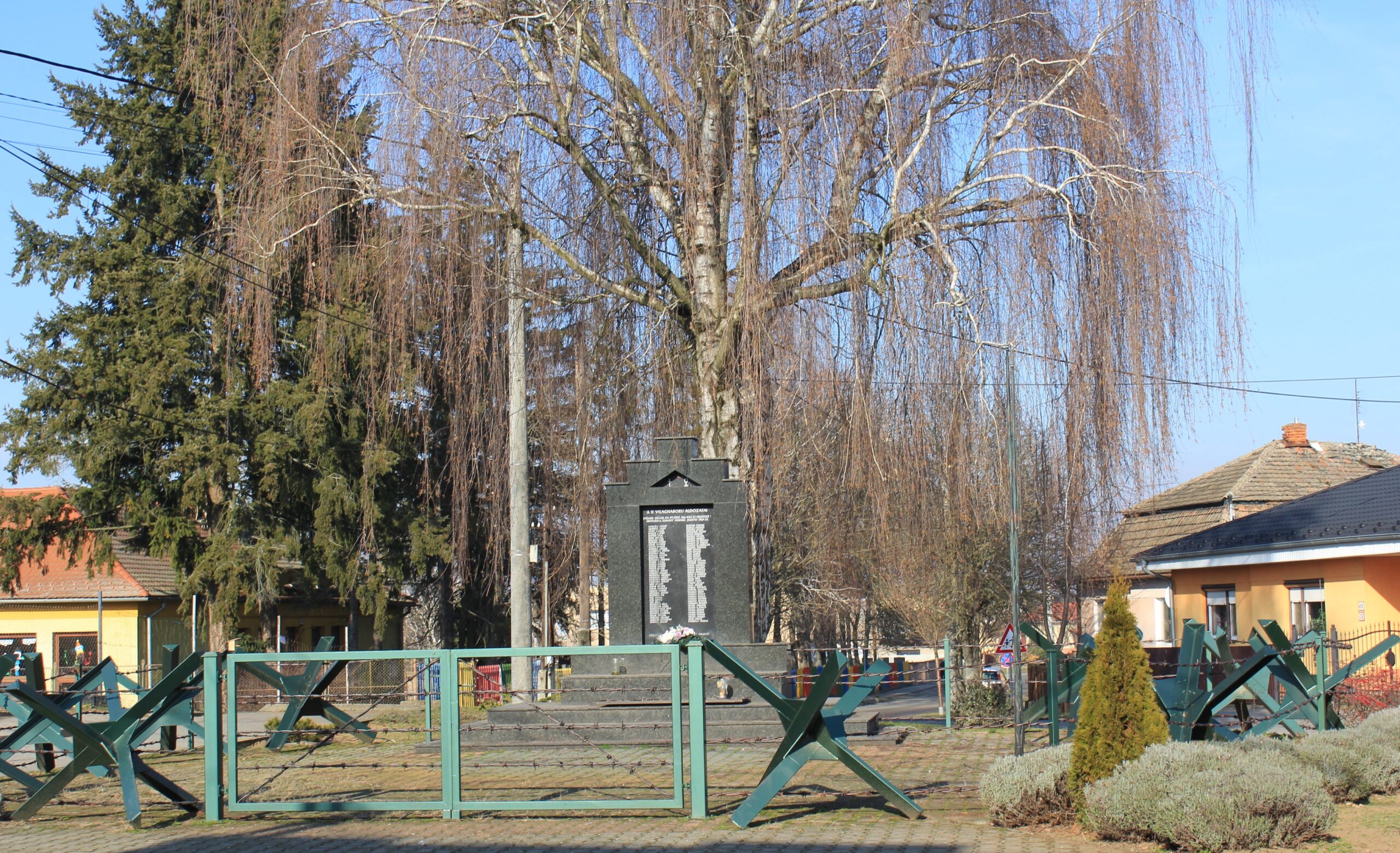 A nevezetes épületegyüttest körbejárva a látogató akarva-akaratlanul is belebotlik még a világháborúban elesettek emlékművébe, amelyet stilizált, de így is méretes tankcsapda- szögesdrót kerítés vesz körül. Megrázó látvány még azok számára is, akik sem a történelem, sem holmi emlékművek iránt nem szoktak lelkesedni.
