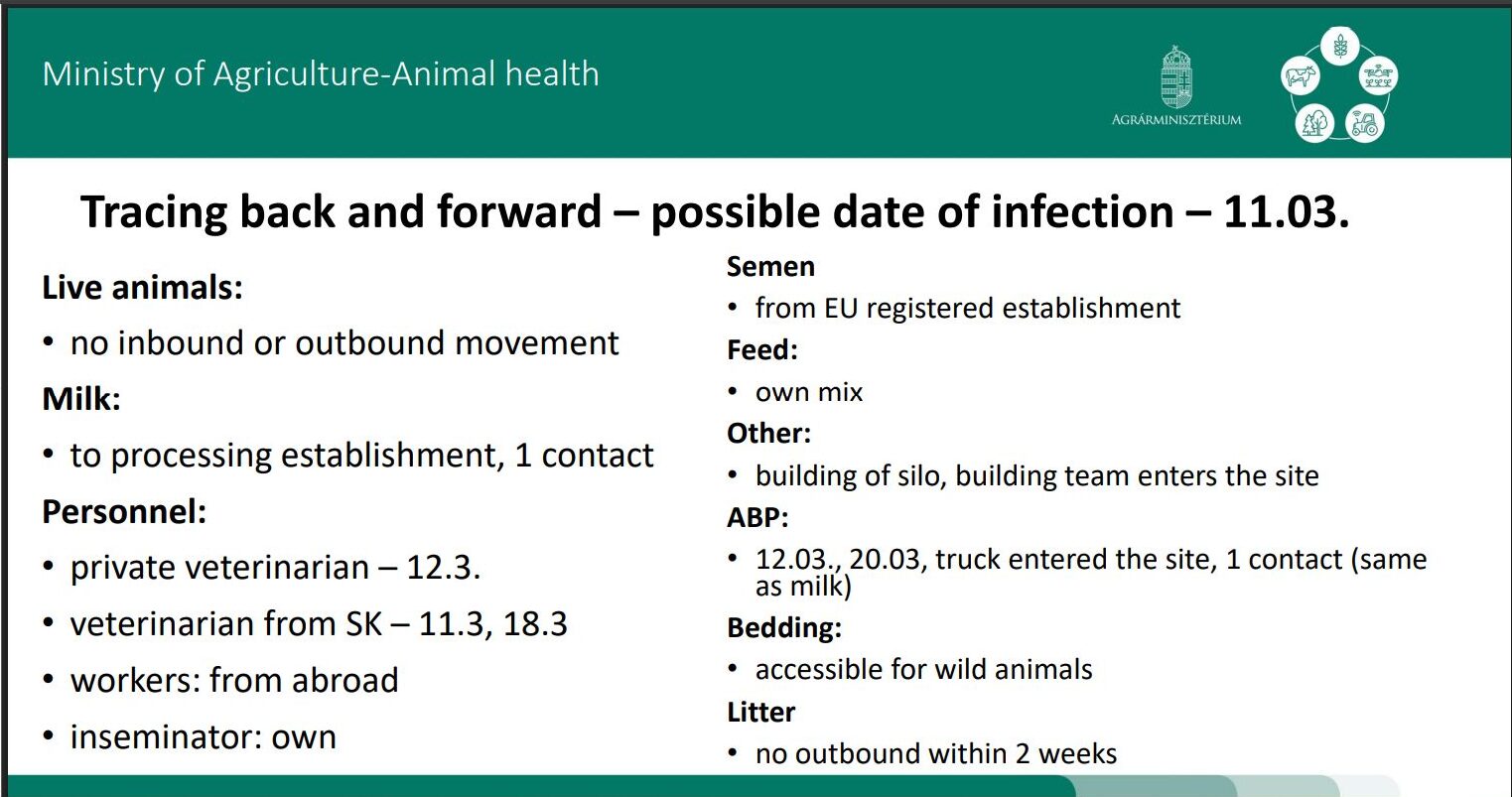 Az egész anyag ITT található. Ez egyfajta oknyomozás, mondhatni visszakövetése annak, hogy honnan és miből kifolyólag érkezhetett a fertőzés a második számú magyarországi gócpontra. Vizsgálják, ki vitte a tejet a telephelyre az elmúlt időszakban, milyen volt az állatok alatti alom származása, megnézték a takarmányt, stb. Közben pedig arról is írnak, hogy milyen mozgás volt ki-be a telepen a betegség felbukkanása előtt.