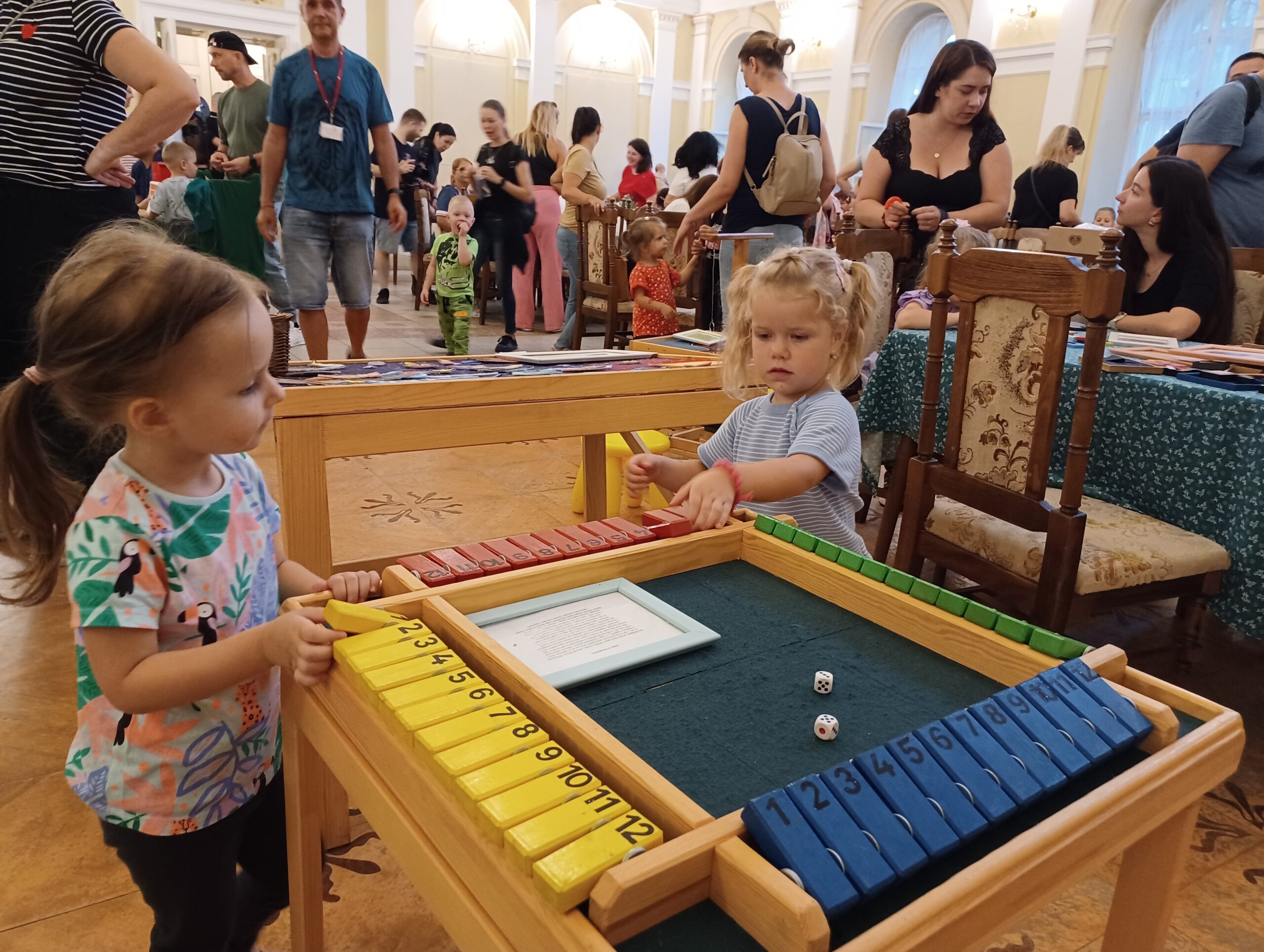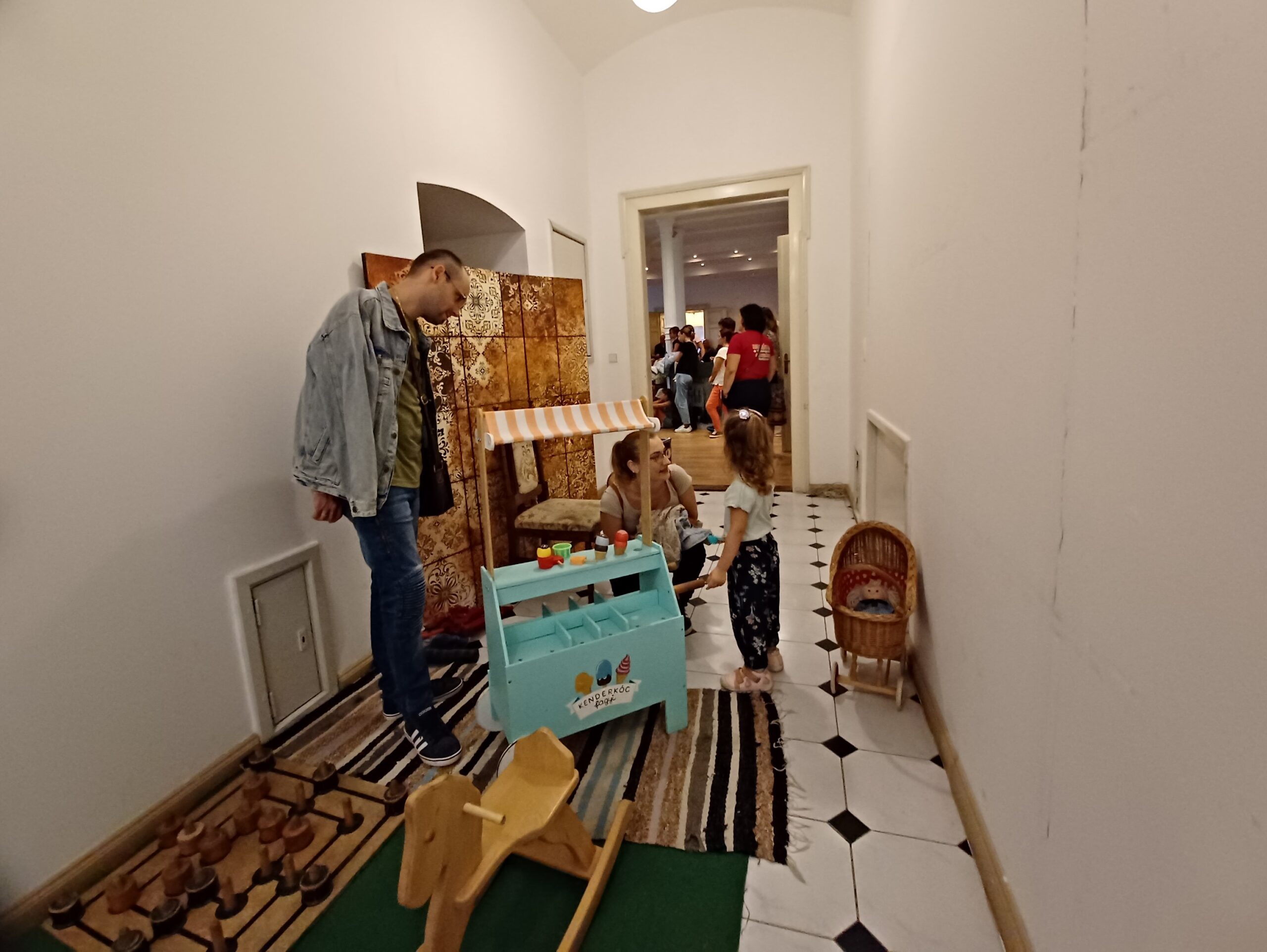 A nagyteremben kibújva esőkabátjaikból ezerféle kézműves foglalkozás várta a csemetéket, így nemezelés, zsinórfonás, bábu, ékszer és babakészítés, megismerkedve közben a hagyományos népi mesterségek hasznos és népgazdagító értékeivel. De a Szinnyei József Könyvtár ifjúsági részletégének jóvoltából szórakozhattak szép kifestőkkel, tölthették az időt mókás rejtvényekkel, kvízzel; s mindezek mellett rengeteg társasjáték is kínálta magát.