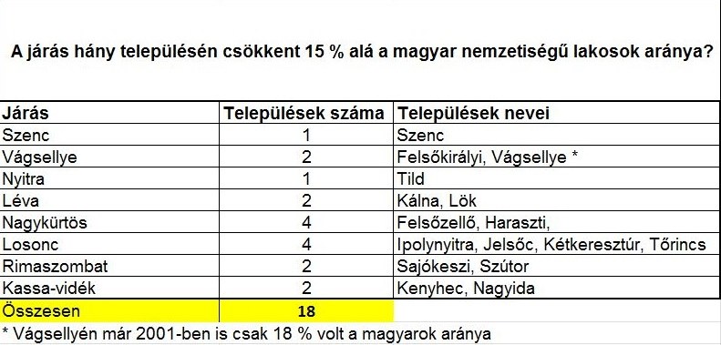 8 járás 18 település, 7 284 itt élő magyar nemzetiségű lakos. Összesen ennyien veszíthetik el a következő két népszámlálás után a lehetőségét annak, hogy lakóhelyükön a hivatalos érintkezésekben használhassák a magyar nyelvet.