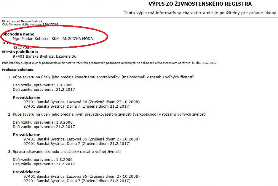 Matian Kotleba ipari engedélyének neve „Marian Kotleba – KKK – angol divat“, ami az ĽSNS elnökének ruhaüzlete. A KKK általános értelemben a Ku Klux Klan nevű rasszista szervezet rövidítése.