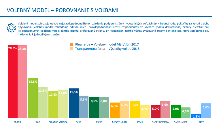 Az SNS ezen a felmérésen 11,5 százalékot kapott, amivel a harmadik legnépszerűbb párt címét nyerte el, ám alig előzi meg nagy kritikusát, Igor Matovičot és az OľaNO-NOVA-t, amely 10,5 százalékot kapna.