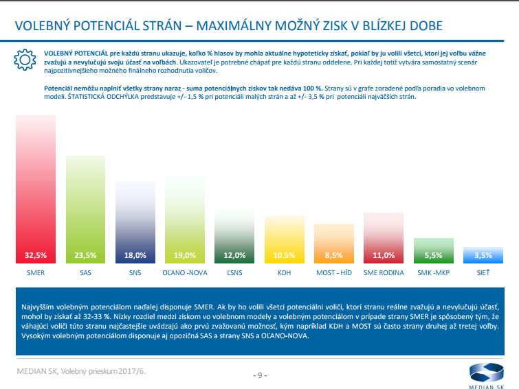 A felmérésben releváns értékekkel bíró pártok közül az SaS, az SNS, a KDH és az MKP erősödött leginkább, a jobboldali liberálisok a tavaly márciusi eredményükhöz 3,4 százalékpontot, a szlovák nemzetiek 2,9 százalékpontot, a kereszténydemokraták 1,6 százalékpontot az MKP pedig 1 százalékpontot javított. A Smer és Kotlebáék lényegében stagnálnak a MEDIAN szerint, ellenben az OľaNO-NOVA 0,5, a Most-Híd 0,5 a Sme Rodina pedig 1,6 százalékponttal esett vissza az elmúlt egy és negyed évben.