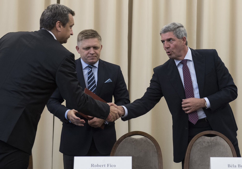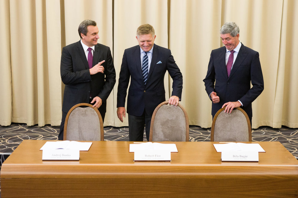 A koalíciós pártelnökök, Robert Fico (Smer-SD), Bugár Béla (Most-Híd) és Andrej Danko (SNS) a Bôrik hotelben aláírták a Koalíciós Szerződés kiegészítését.