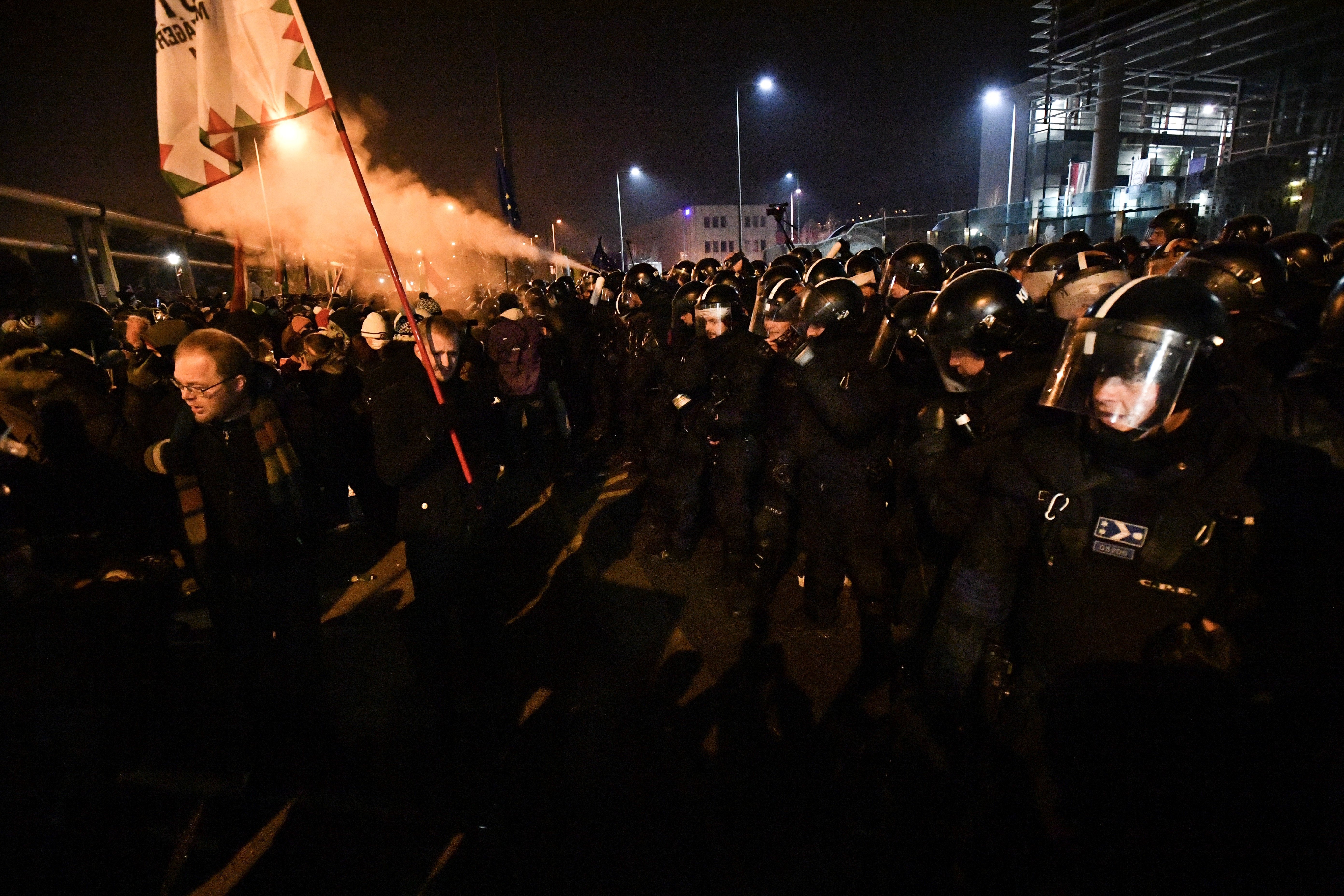 A Boldog karácsonyt, miniszterelnök úr! címmel meghirdetett kormányellenes demonstráció résztvevõi a rendõrsorfallal szemben az MTVA Kunigunda utcai székházánál 2018. december 16-án.