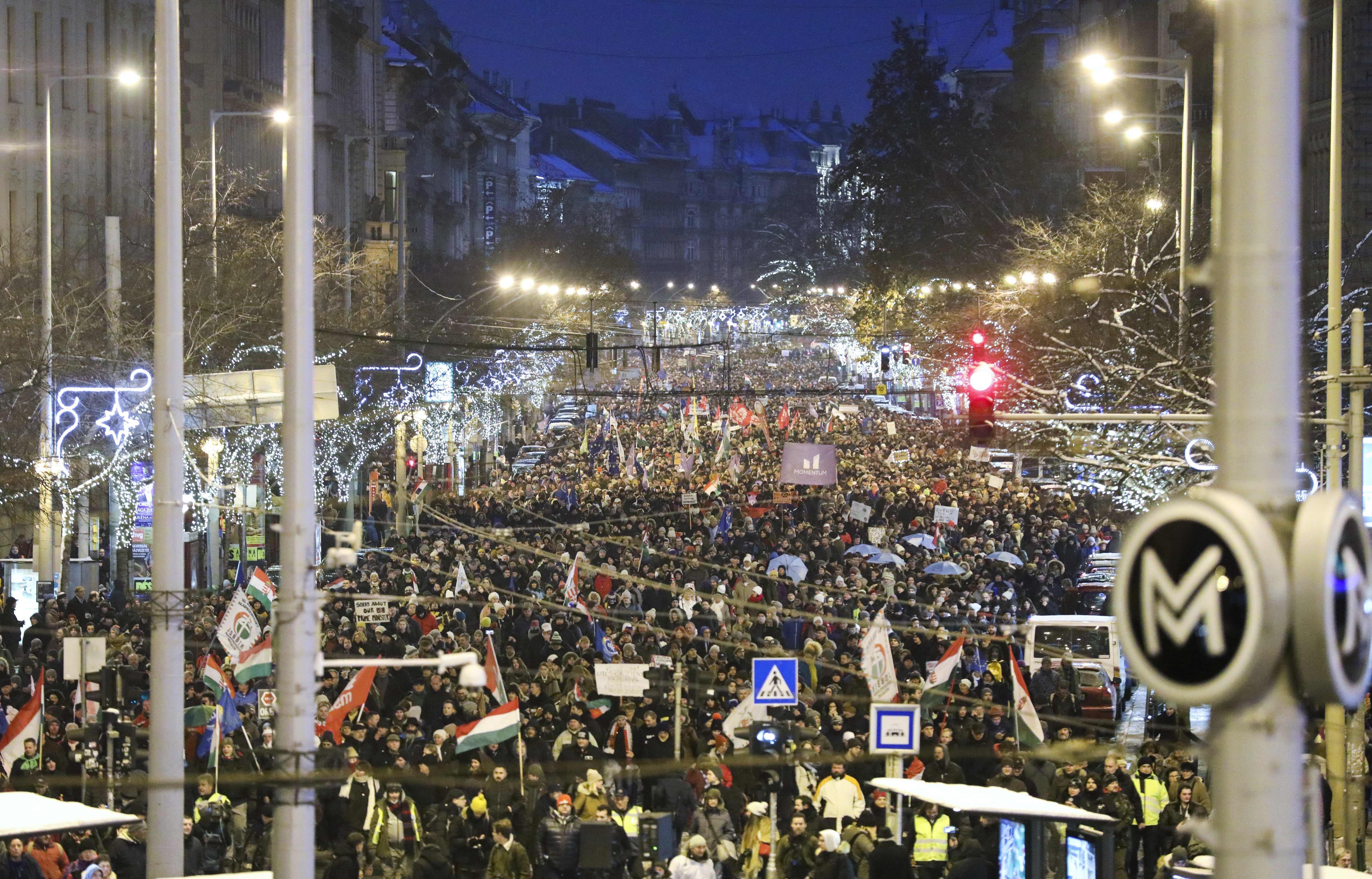 A Boldog karácsonyt, miniszterelnök úr! címmel meghirdetett kormányellenes demonstráció résztvevõi a Teréz körúton 2018. december 16-án.