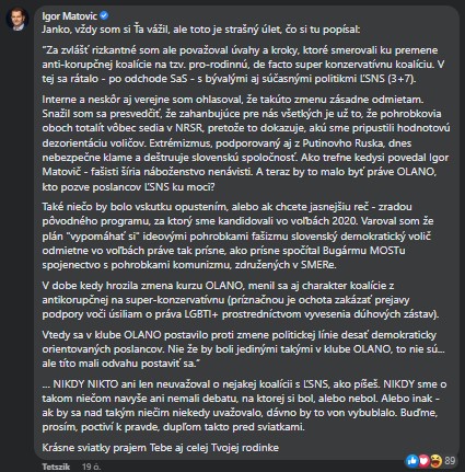 „Janko, mindig is becsültelek, de most nagyon elszálltál azzal, amit írtál. (..) Soha senki még csak nem is fontolgatott semmilyen koalíciót az ĽSNS-szel, szemben azzal, amit írtál. Ráadásul erről soha nem is folytak egyeztetések, amelyen ott lehettél volna. Vagy másképp fogalmazva: ha egy ilyen lehetőség bármikor felmerült volna, már rég napvilágra került volna. Legyünk igazságosak, főleg így, ünnepek előtt”