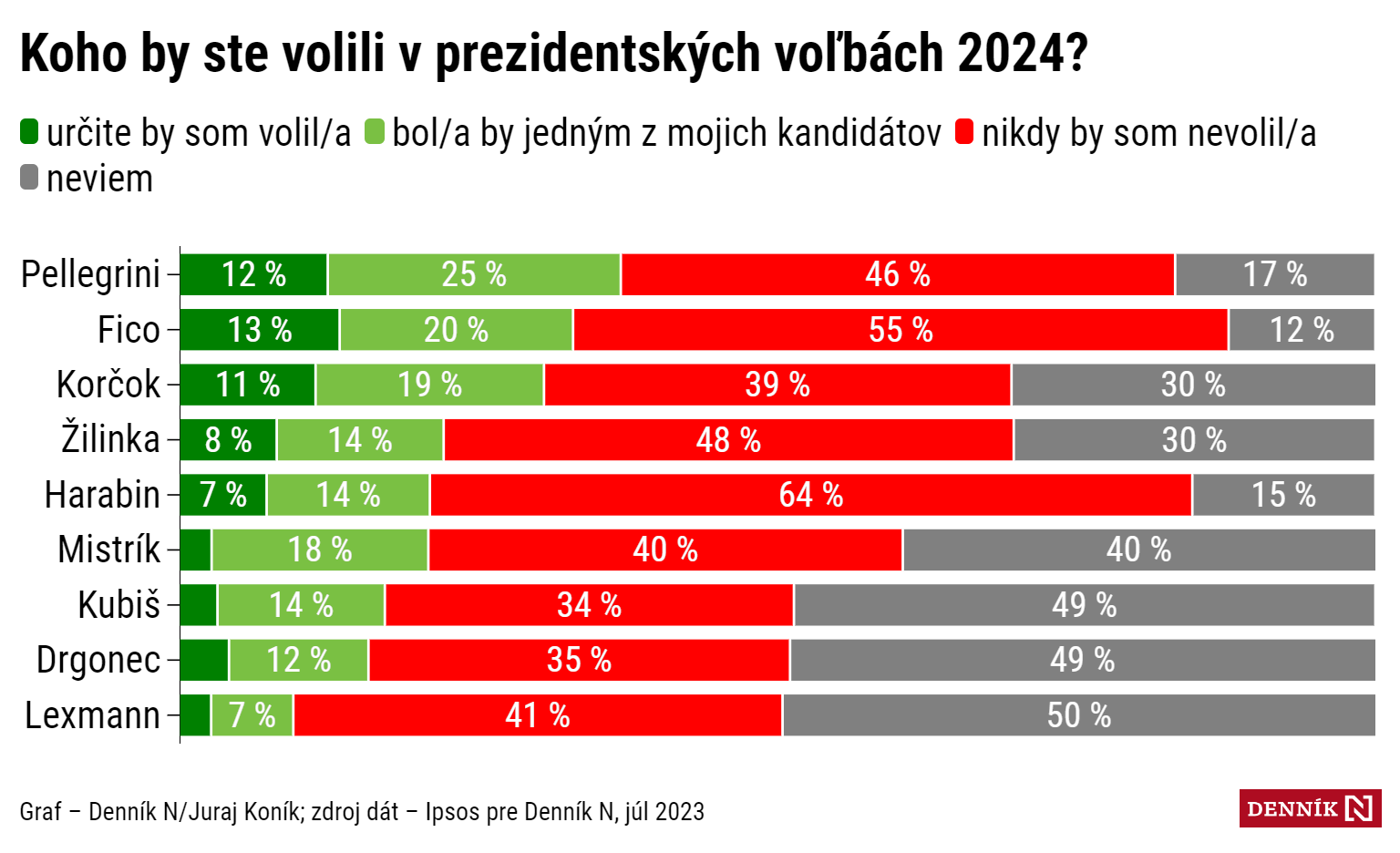 A fent említettek közül egyébként Pellegrininek lehetne a legnagyobb esélye, miután a megkérdezettek 25 százaléka jelölte meg az „egyik jelöltjének”. Ficot a megkérdezettek 20 százaléka tartja az egyik lehetséges jelöltjének, Korčokot 19, Žilinkát és Harabint pedig 14 százalék.