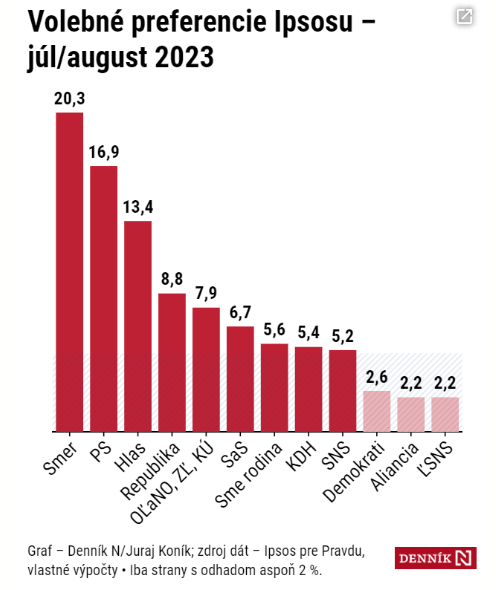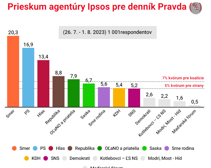 Az Ipsos legújabb, július végén-augusztus elején készült felmérése szerint a választásokat nem meglepő módon a Smer-SD nyerné a szavazatok 20,3 százalékával. A második a Progresívne Slovensko lenne 16,9 százalékkal, a harmadik helyen pedig a Hlas-SD zárna, akit az Ipsos ügynökség választási modellje szerint a szavazók 13,4 százaléka választana.
