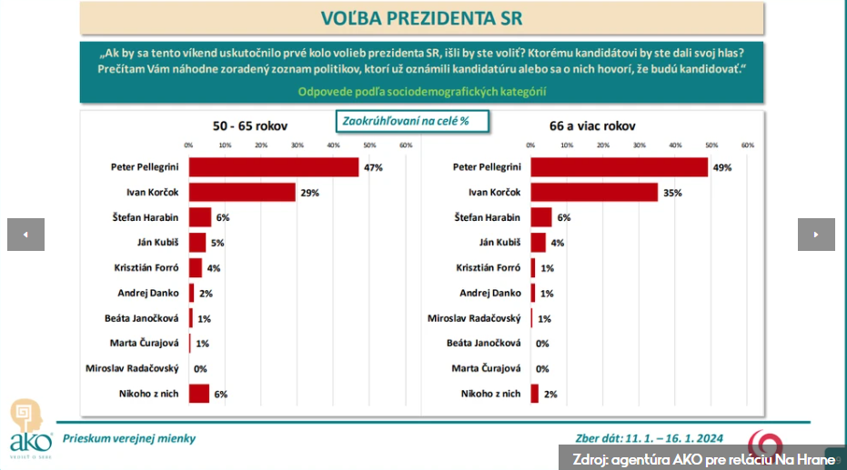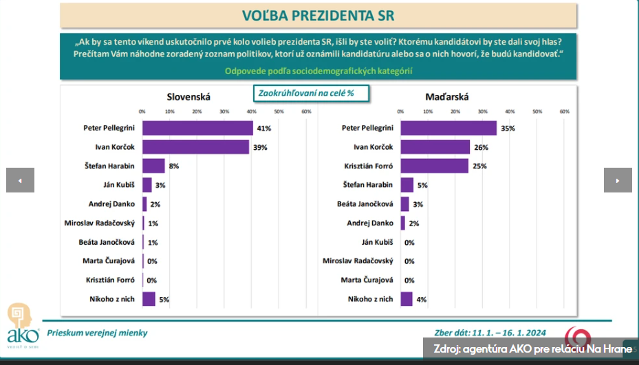 Ha ezen a hétvégén tartanák az államfőválasztást Szlovákiában, azt az AKO ügynökség szerint Peter Pellegrini nyerné meg 40,6 százalékkal, míg a második körben kihívója Ivan Korčok lenne, aki a szavazatok 37,7 százalékát kapná meg elsőre.