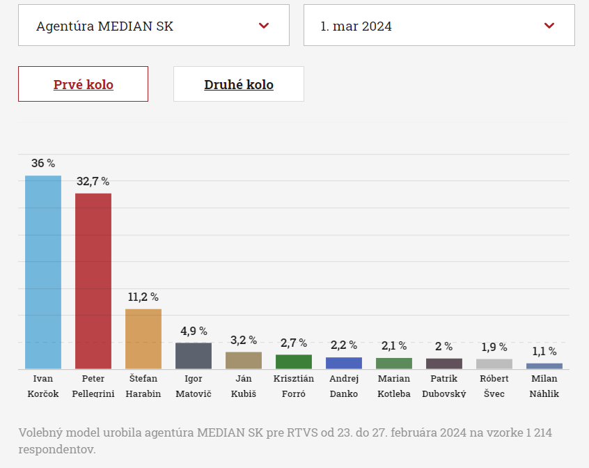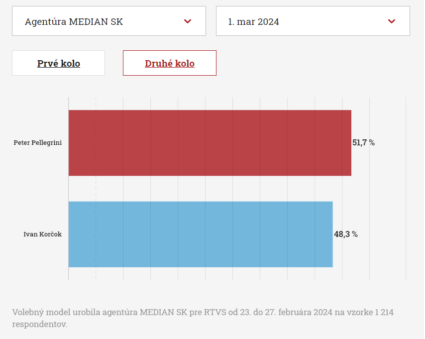 A választások második körébe így Ivan Korčok és Peter Pellegrini kerülnének. Ezt a párharcot pedig a jelenlegi házelnök nyerné meg, miután – a felmérés szerint – a szavazók 51,7 százaléka adná neki karikáját. Ivan Korčok csak a szavazatok 48,3 százalékát szerezné meg, ezzel lecsúszna az elnöki székről.