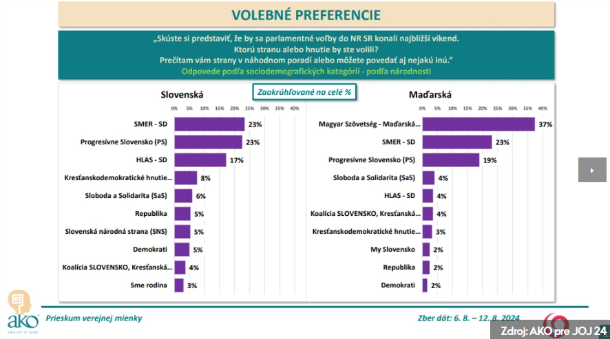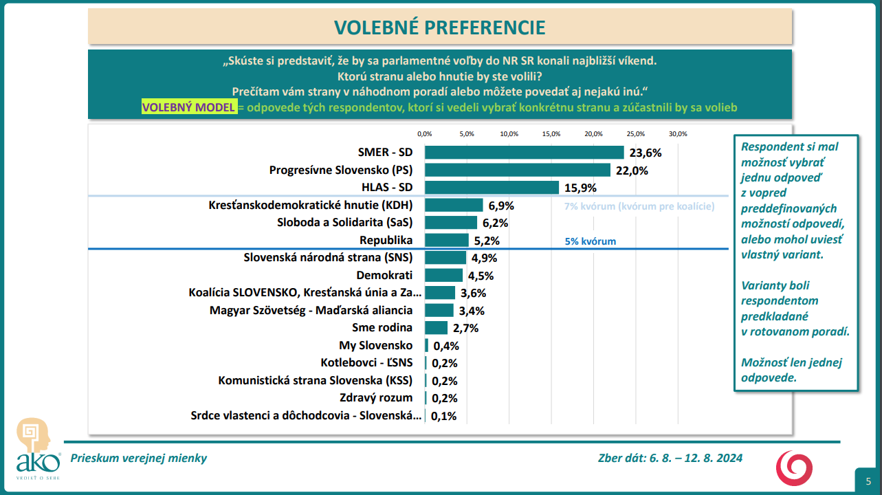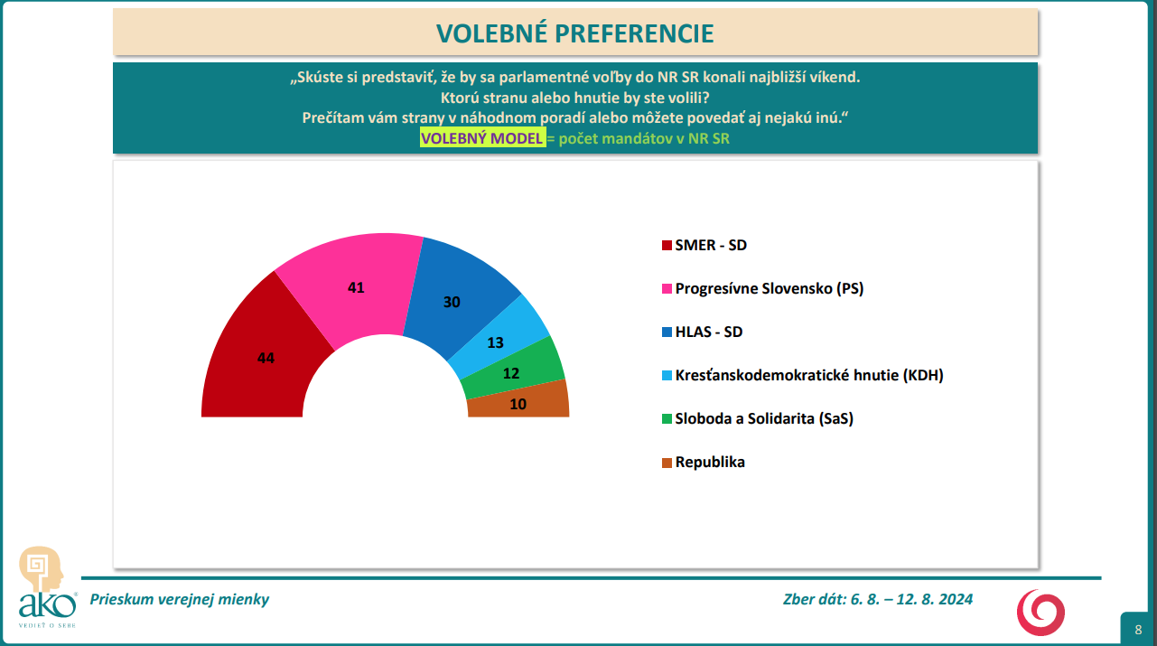 Ha augusztusban lennének a parlamenti választások, akkor ismét a Smer lenne a befutó. Robert Ficóék 23,6 százaléknyi szavazatot kapnának a felmérés szerint. A második helyen a liberális Progresívne Slovensko áll 22 százalékkal, míg harmadikként az államfőt is adó Hlas-SD jutna be 15,9 százalékkal.