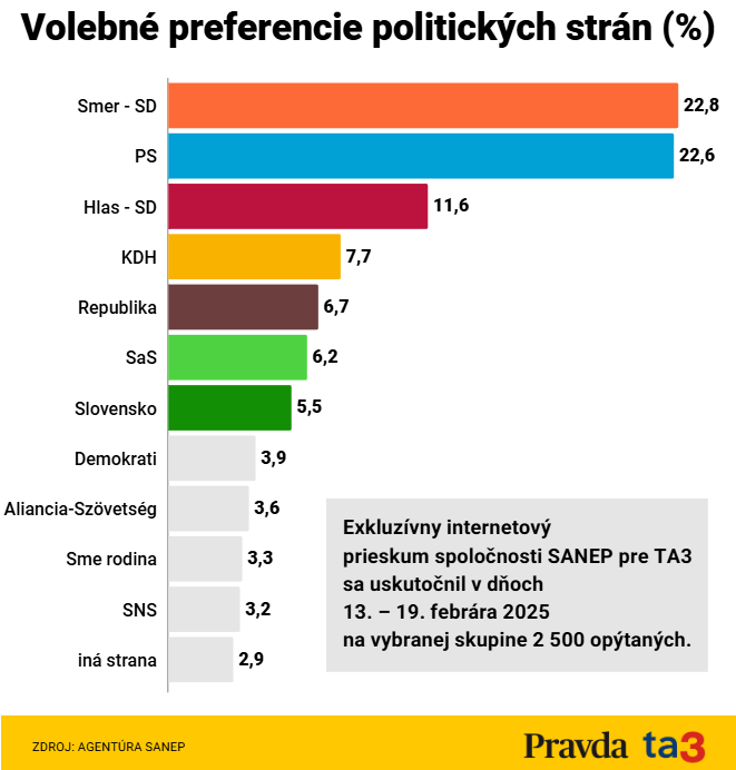 A SANEP ügynökség a TA3 televízió számára készített exkluzív felmérése szerint a Smer 22,8%-os támogatottsággal nyerte volna meg a parlamenti választásokat február második felében. Ez a párt számára 0,5 százalékpontos növekedést jelent az előző hónaphoz képest.