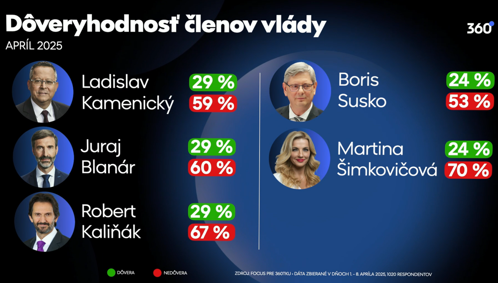 Boris Susko igazságügyi miniszter (Smer-SD) és Martina Šimkovičová kulturális miniszter (SNS jelöltje) egyaránt 24%-os bizalmi arányt ért el, míg Suskónál 53%, Šimkovičovánál pedig igen magas, 70% a bizalmatlanság.