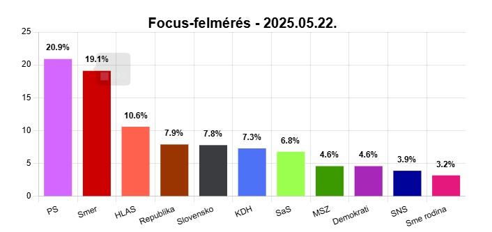 A Focus ügynökség 360tka.sk-nak készített friss felmérése szerint továbbra is a progresszív PS vezeti a mezőnyt a politikai pártok preferencia versenyében. Tőle szűk két százalékponttal lemaradva a Smer a második. A HLAS továbbra is gyengélkedik, a Republika és a Slovensko pedig egyre erősebb. A Magyar Szövetség a szokott hibahatárokon belül a parlamenti küszöb alatt holtversenyben a Demokratival. Az SNS nem jutna be a parlamentbe.