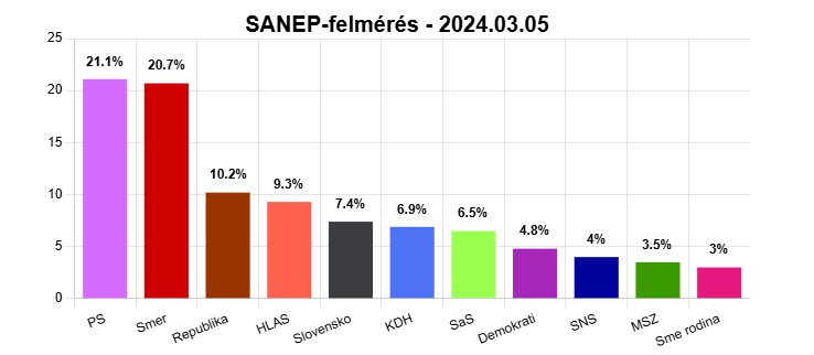A SANEP ügynökség friss felmérése szerint a választást ugyan a PS nyerné meg, de továbbra is ugyanazokkal a súlyos problémákkal szembesül. Egyrészt, képtelen nagyobb támogatottságot kisajtolni magának, vagyis a párt elérte a zenitjét. A másik probléma, hogy egyre csökken a vele kompatibilis pártok száma, és ha nem sikerül betolni a Demokrati-t vagy a vele most már nyíltan együttműködésre törekvő Magyar Szövetséget a parlamentbe, akkor nagyon nehéz kormányalakítás elé néz. A Magyar Szövetség, a HLAS és az SaS is komoly nehézségekkel szembesül, míg a Smernek arra kell felkészülnie, hogy a jelenlegi állásból kormánypózícióra nemigen számíthat.