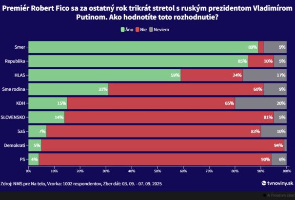 Az NMS ügynökség a TV Markíza számára készített exkluzív kutatásából kiderül, hogy a megkérdezettek 40 százaléka helyesli, hogy Robert Fico az elmúlt egy évben háromszor is találkozott Vlagyimir Putyinnal. Ezt a véleményt leginkább a 65 év felettiek és a szakmunkás végzettségűek osztják.