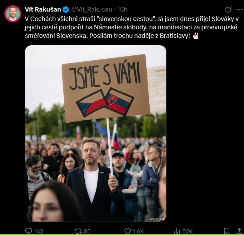 Érdekes adalék, hogy a tüntetésen részt vett Vít Rakušan cseh belügyminiszter is, aki több posztot is szentelt az X-en az eseménynek támogatását kifejezve. Kérdés, hogy ez mennyire segít az amúgy is ingoványos talajon álló szlovák-cseh kormányközi kapcsolatokon, ill. hogy reagál-e az ügyre Robert Fico kormánya.