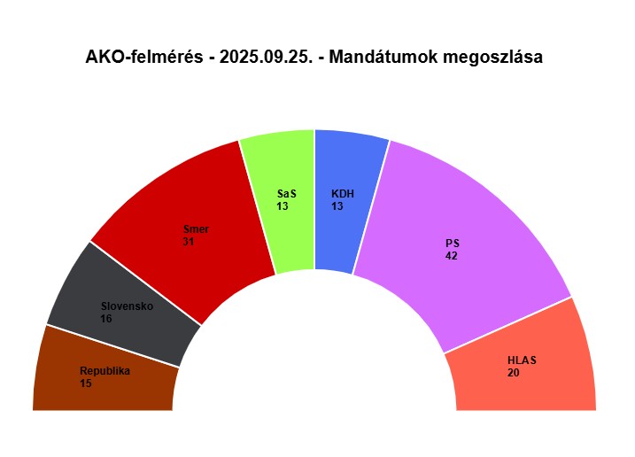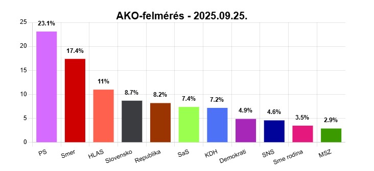 A PS elszállt, a szavazatok 23,1 százalékát szerezné meg, miközben a Smer szűk 6 százalékponttal le van maradva. A Slovensko közben feljött, a Republikával verseng a harmadik helyért. A KDH és az SaS 7 százalék felett, de ez a gyakorlatban még jelenthet kieső helyet. A Demokrati a sajtó hathatós támogatása ellenére 4,9 százalékkal továbbra is küszöb alatt. Az SNS mintha erősödött volna, és a jelentéktelenek ligájában az állami támogatásra pályázók közé került be a Sme rodina is.