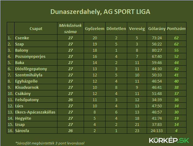 A bajnokság állása 27 forduló után: