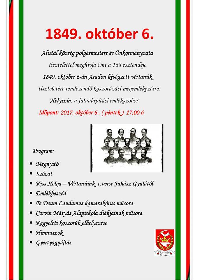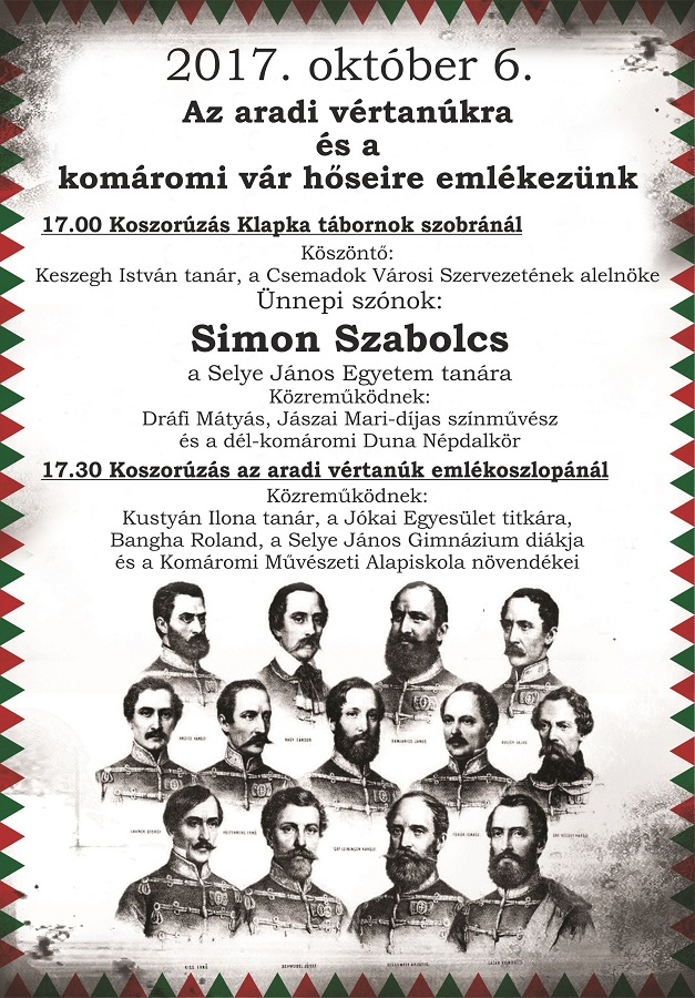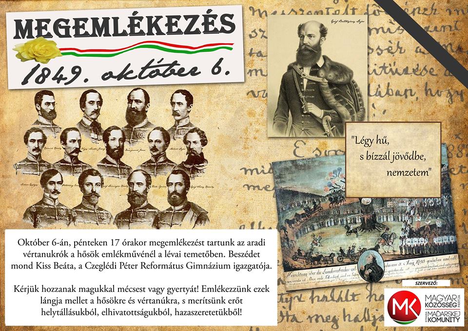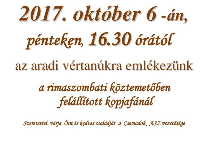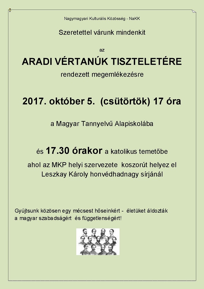 Almágy község Önkormányzata, az Alapiskola és Óvoda Almágy, a Csemadok és a Magyar Közösség Pártja helyi alapszervezete ünnepi megemlékezést és koszorúzást tart az aradi vértanúk tiszteletére 2017. október 6-án (pénteken) 16:00 órai kezdettel.
